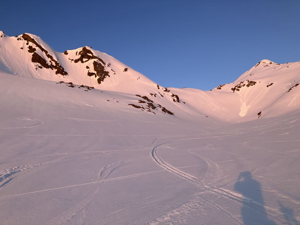 Start an der Maighelshütte um fünf, Aufstieg bretthart, aber beste Abfahrtsverhältnisse ab 8:30 Uhr. Gute Trittspur zum Gipfel. Wir haben unter dem Gipfel mach Norden gequert und sind dann über den Nordgrat rauf. War für uns bestimmt besser als der Südgrat.