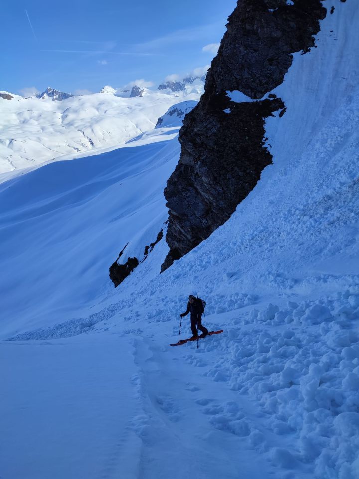 Abfahrt über die Bocchetta di Val Maggia war sehr gut (leicht angesulzt). Die Unten haben wir noch einmal angefellt und sind bis kurz vor Landesgrenze raus gequert von wo man mit guter Linienwahl (und Wachs) mit wenig Stock-Unterstützung rausfahren kann.