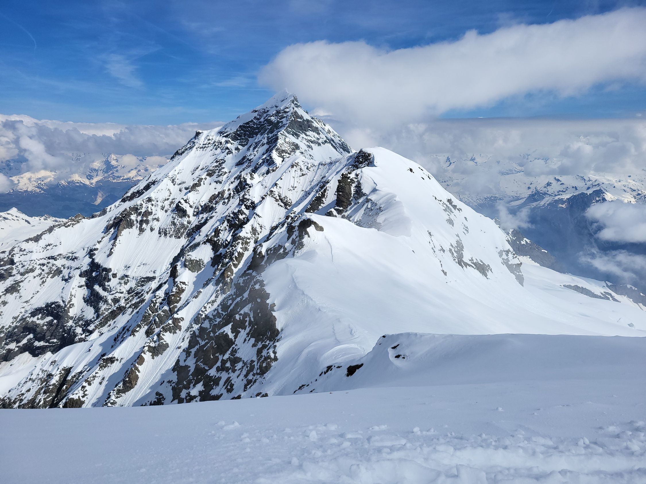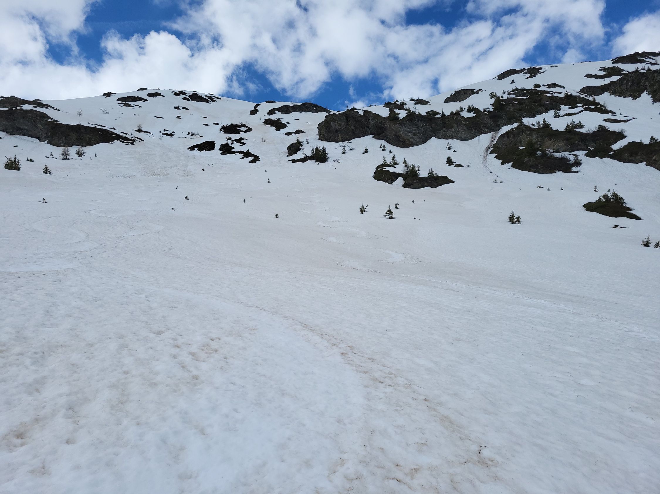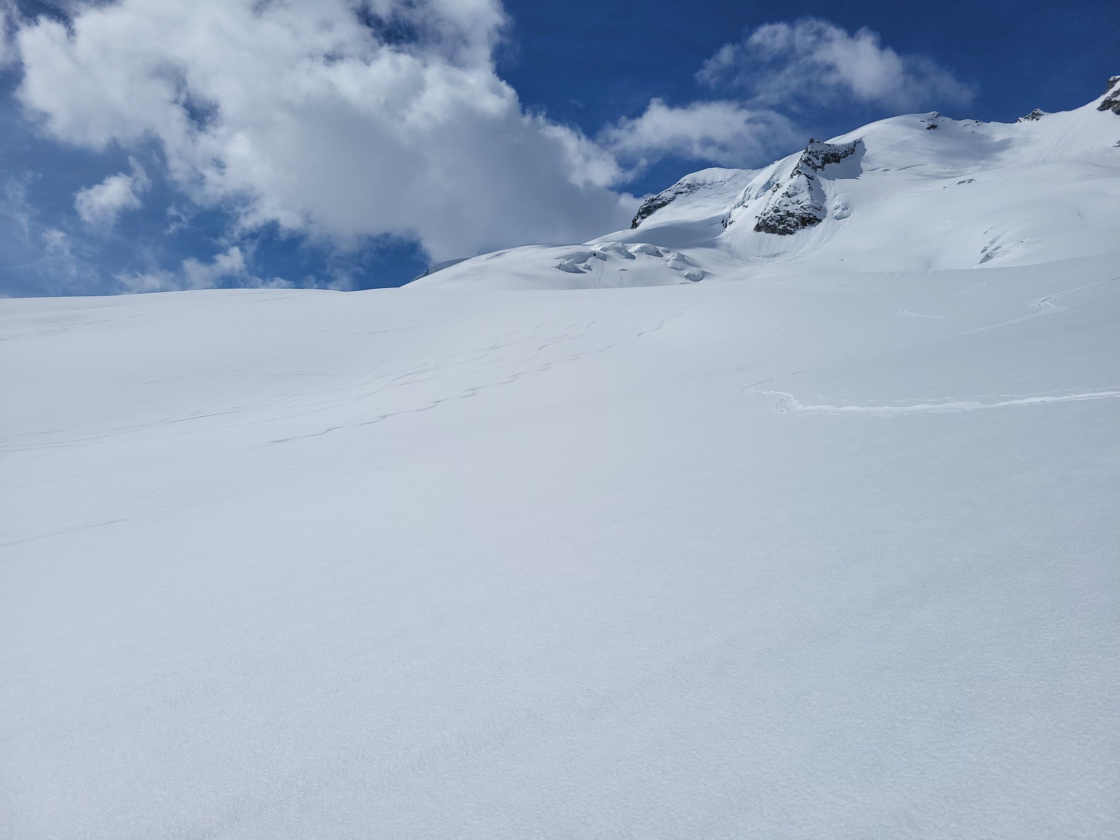 Gipfel teilweise in Wolken. Oben Bruchharsch, in der Mitte schöner Firn. Unten dann Sulz