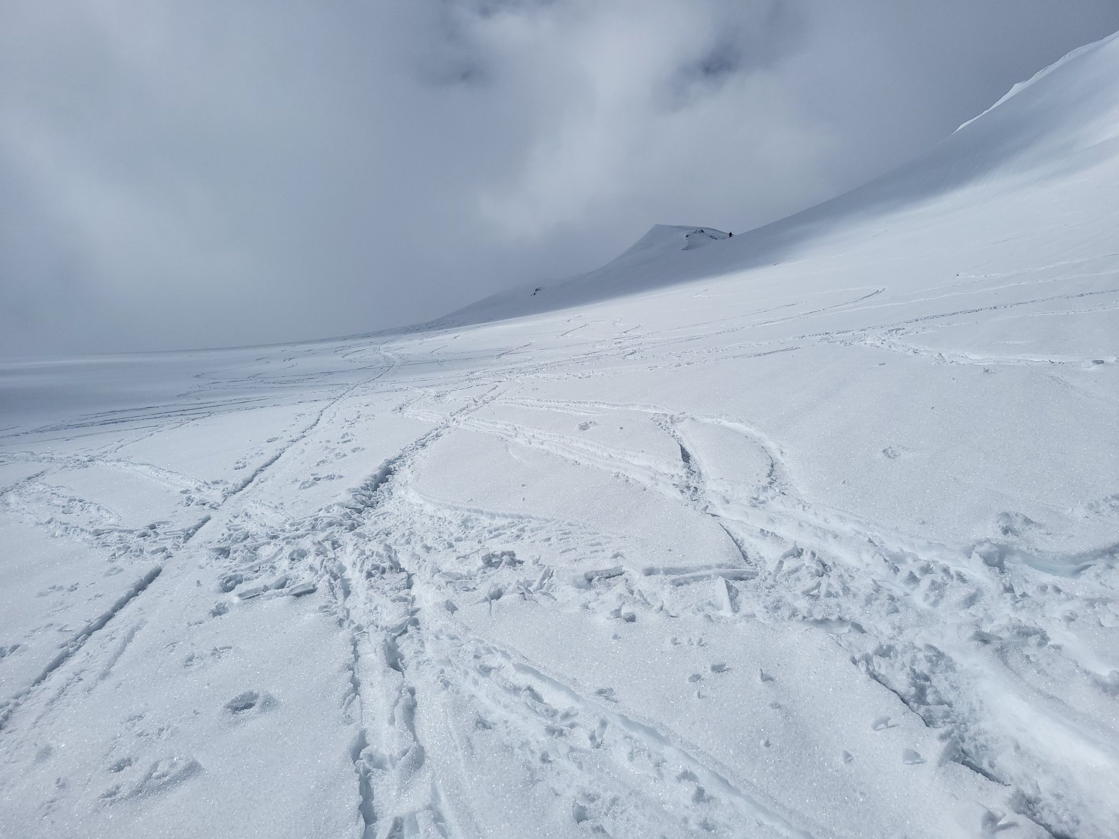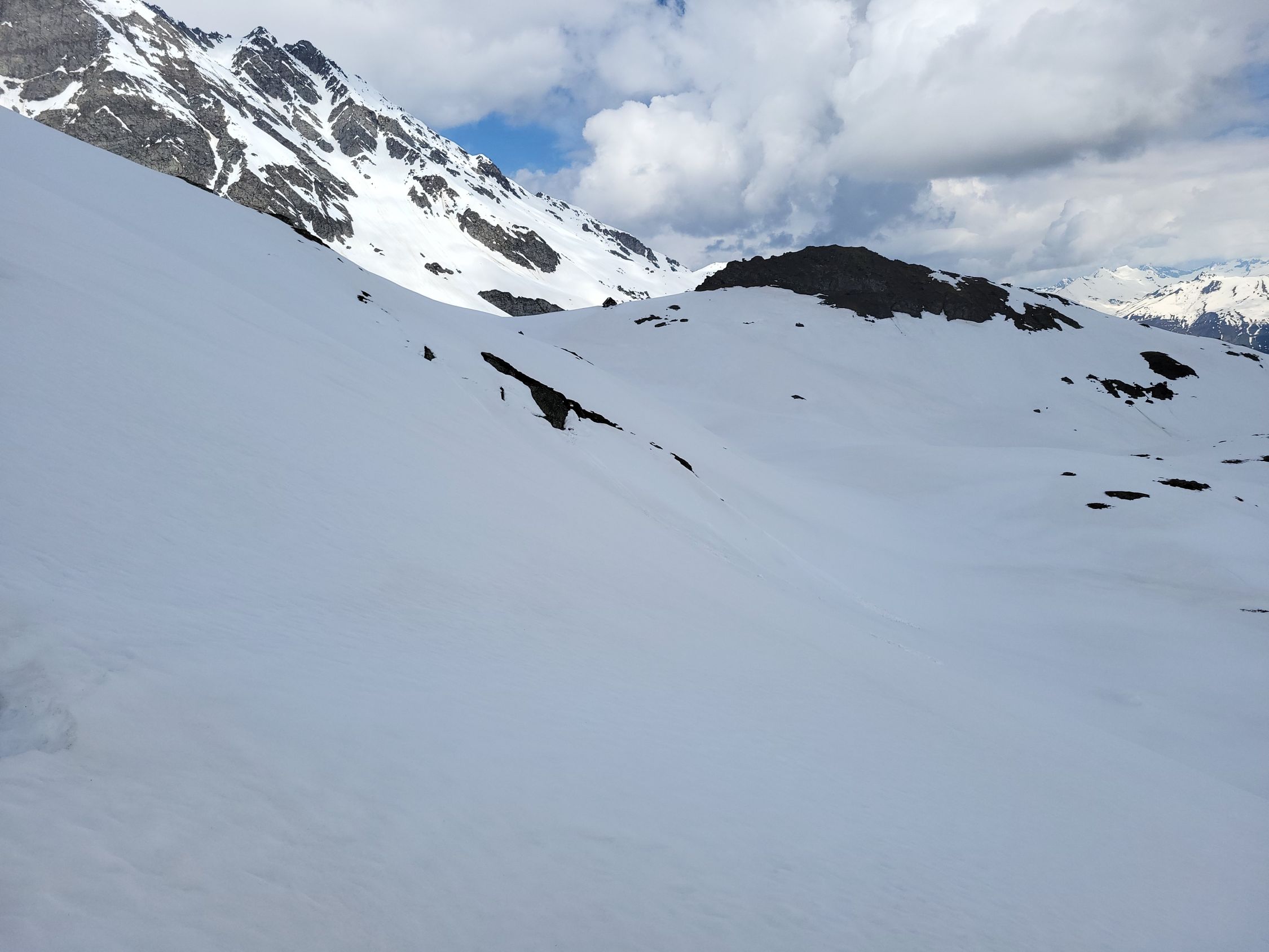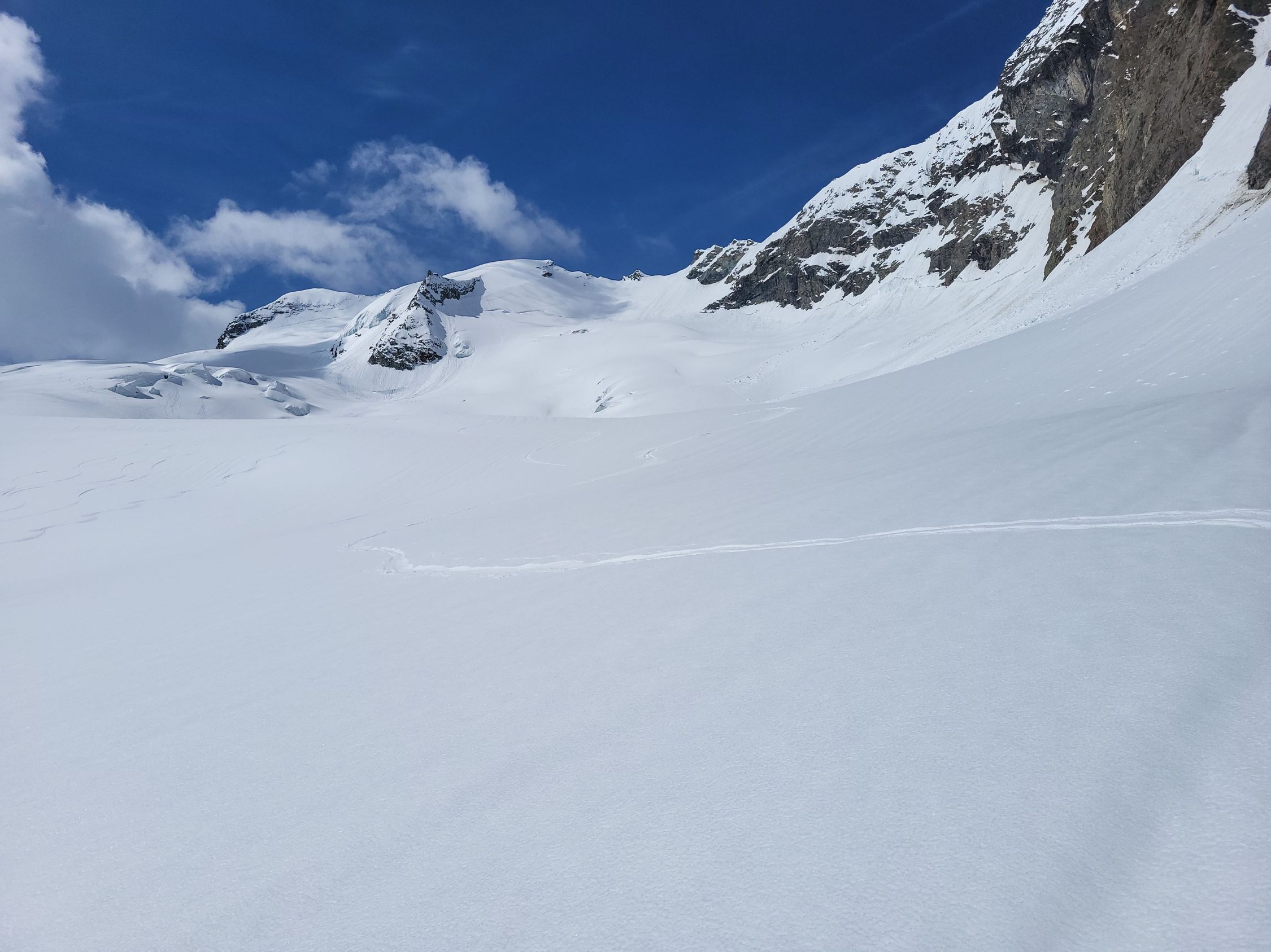 Gipfel teilweise in Wolken. Oben Bruchharsch, in der Mitte schöner Firn. Unten dann Sulz