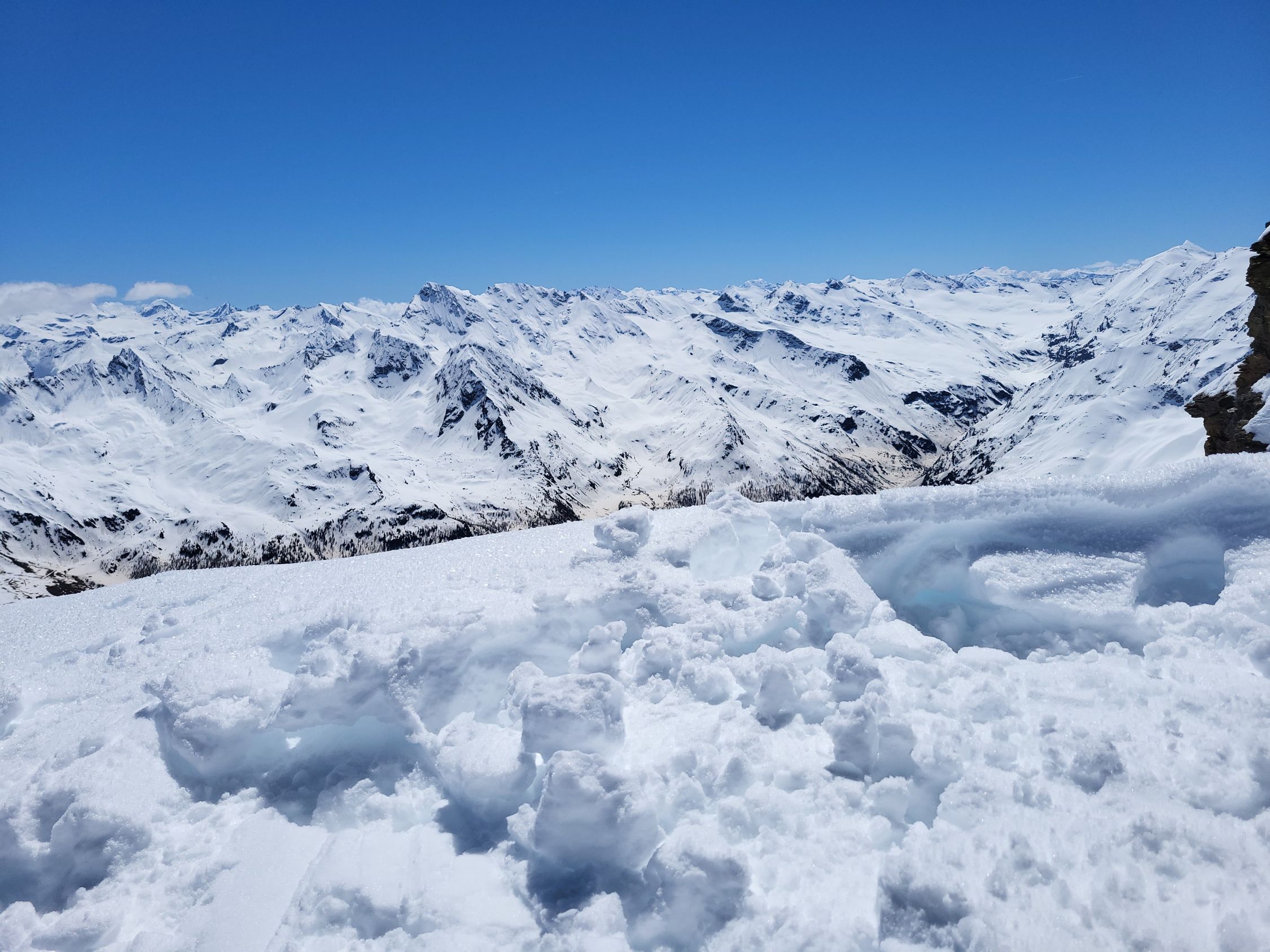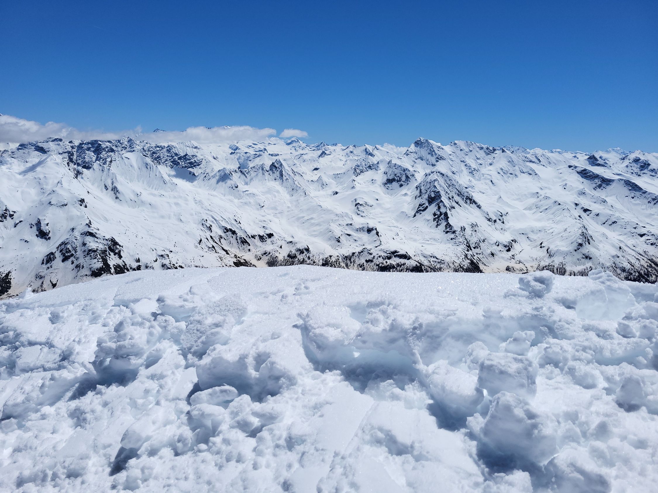 Die Abfahrt war oben nicht so besonders, zerwühlt und Bruchharsch. Kleiner Gegenanstieg zurück zur Scharte. Im weicher werdenden Schnee ins Tal. Nur ca. 150Hm Ski tragen