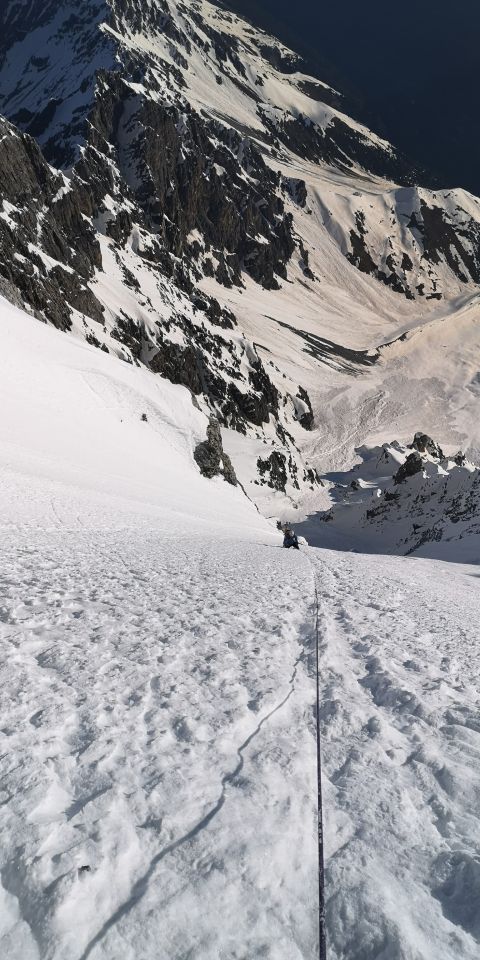 Nach klare Nacht und optimaler Durchfrierung der Schneedecke tragfähiger Harschdeckel ab 2200m. In der Sturzbahn der Seracs verdichteter Schnee von den Lawinden und schnelles Vorankommen möglich. Nach dem Einflussbereich guter Stapfschnee. In der Gurgel 2m Felskontakt, danach super Verhältnisse zum raus queren, keine Sicherung sinnvoll möglich bzw. Erforderlich. Den Blankeisteil kletterten wir im rechten Bereich in 2 Längen am laufenden Seil, das waren ca. 350m bis zum Aussteigen.