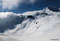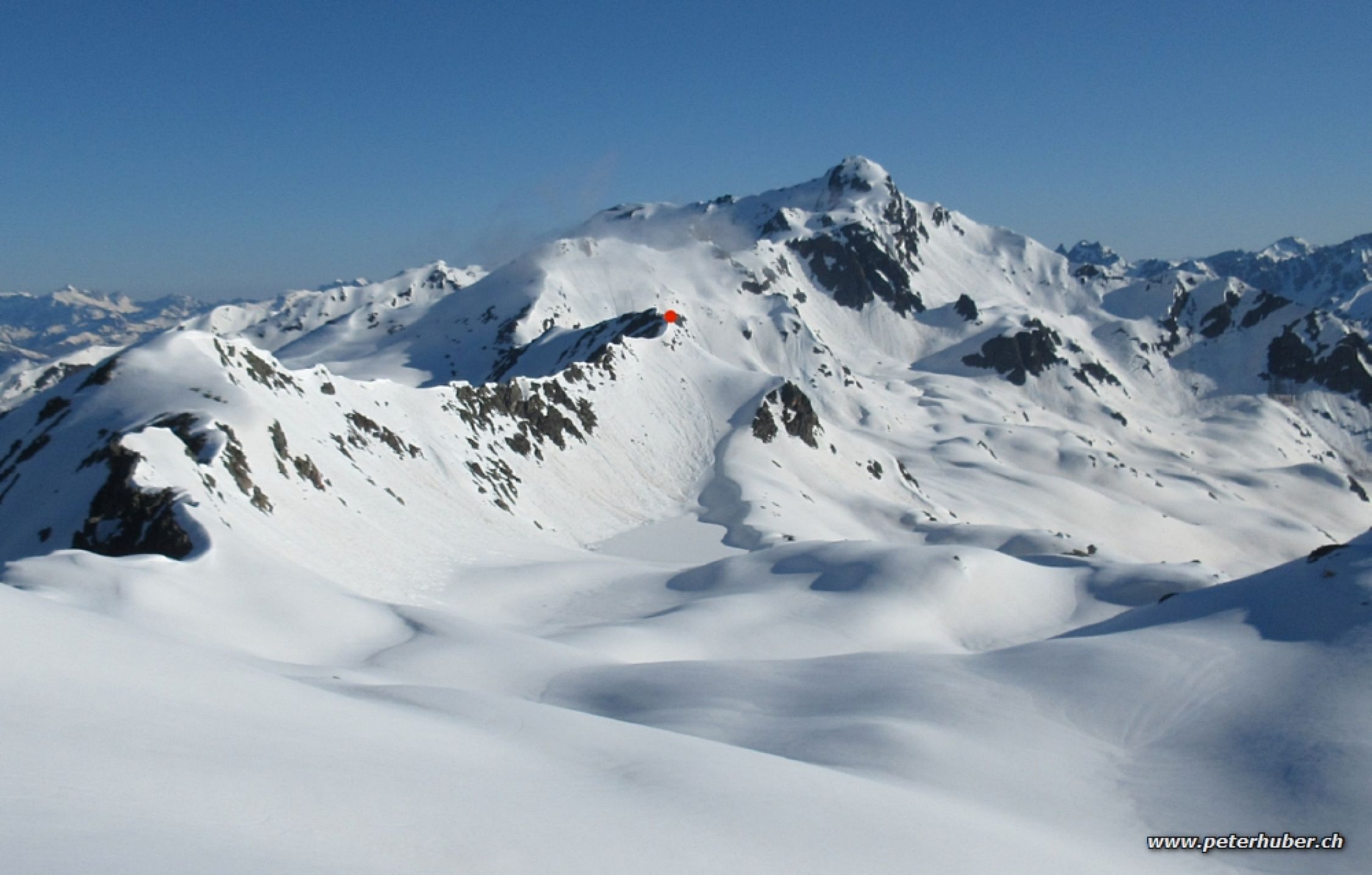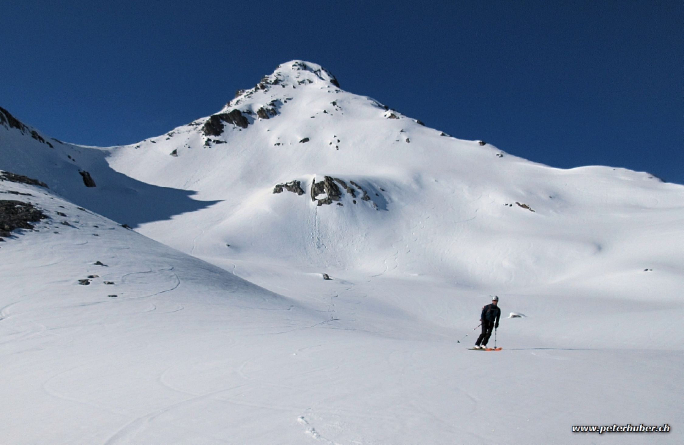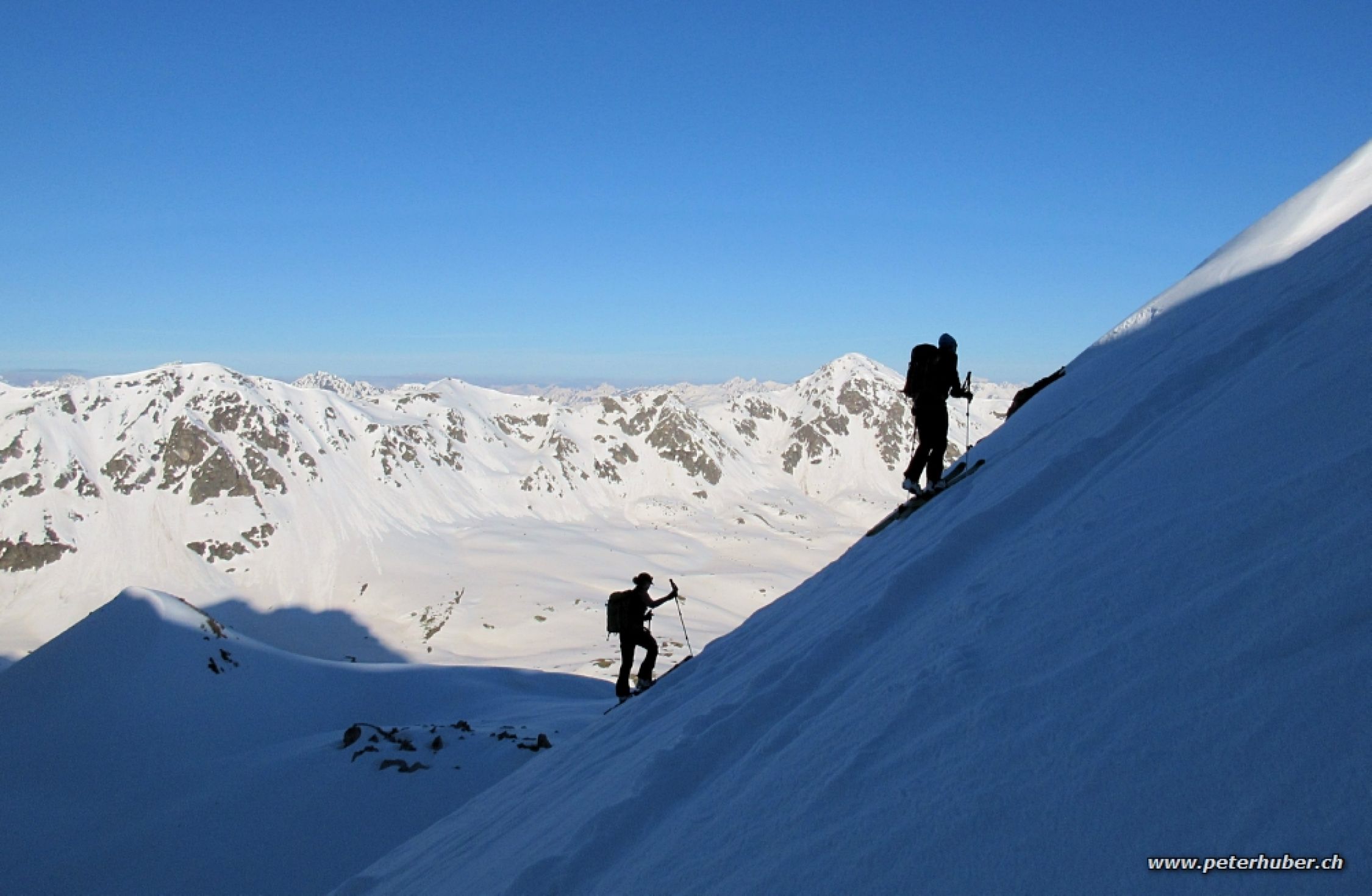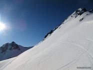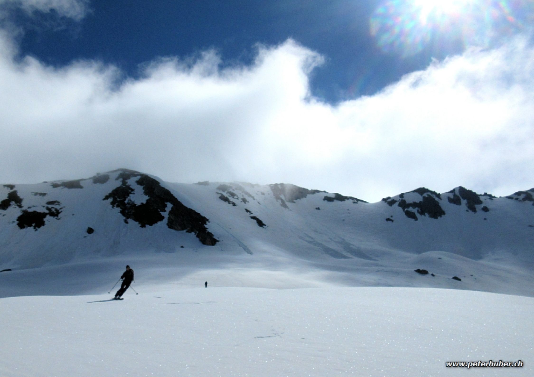 Start um 6 Uhr bei der Wägerhütta 2206 m. Es hat genug Schnee auf der ganzen Strecke. Der Schnee war gut gefroren und hart getragen. Harscheisen beim ersten Aufstieg hilfreich. Anfangs strahlend blauer Himmel. Doch es drückten schon früh Wolken von Süden über den Flüelapass. Wegen der drückenden Wolken stiegen wir nur bis zum Skidepot auf. Somit hatten wir eine schön sonnige Abfahrt.