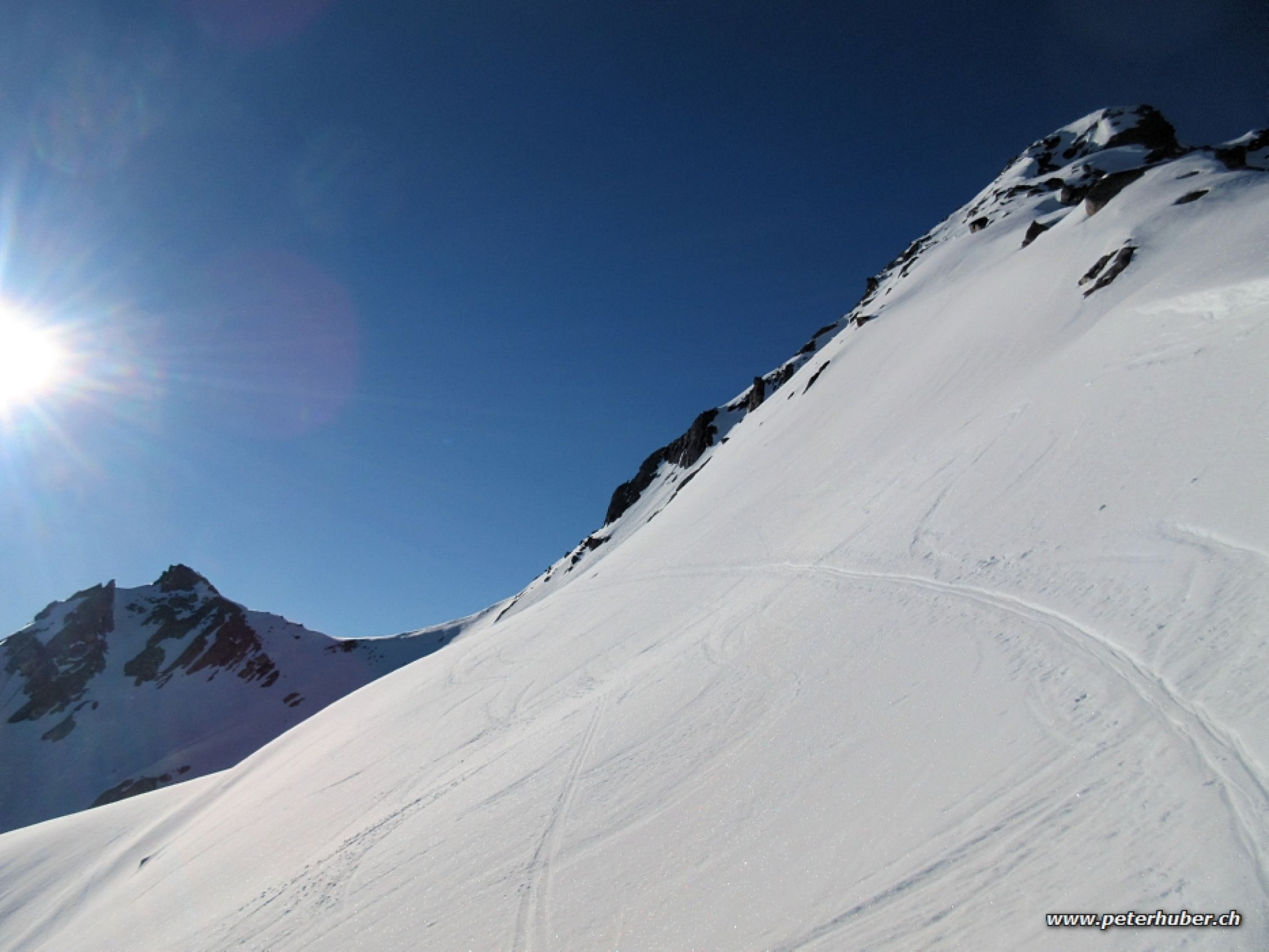 2. Abfahrt um 9:30 Uhr: Anfangs kurz ruppig. Dann nochmals traumhaft. Fast keine alten Spuren, alles wunderbar glatt. Oben hart und griffig. Ab der Mitte leicht aufgesulzt. Unterhalb 2300 m hat es dann Büsserschnee/Wellblechschnee - aufgesulzt OK zu fahren.