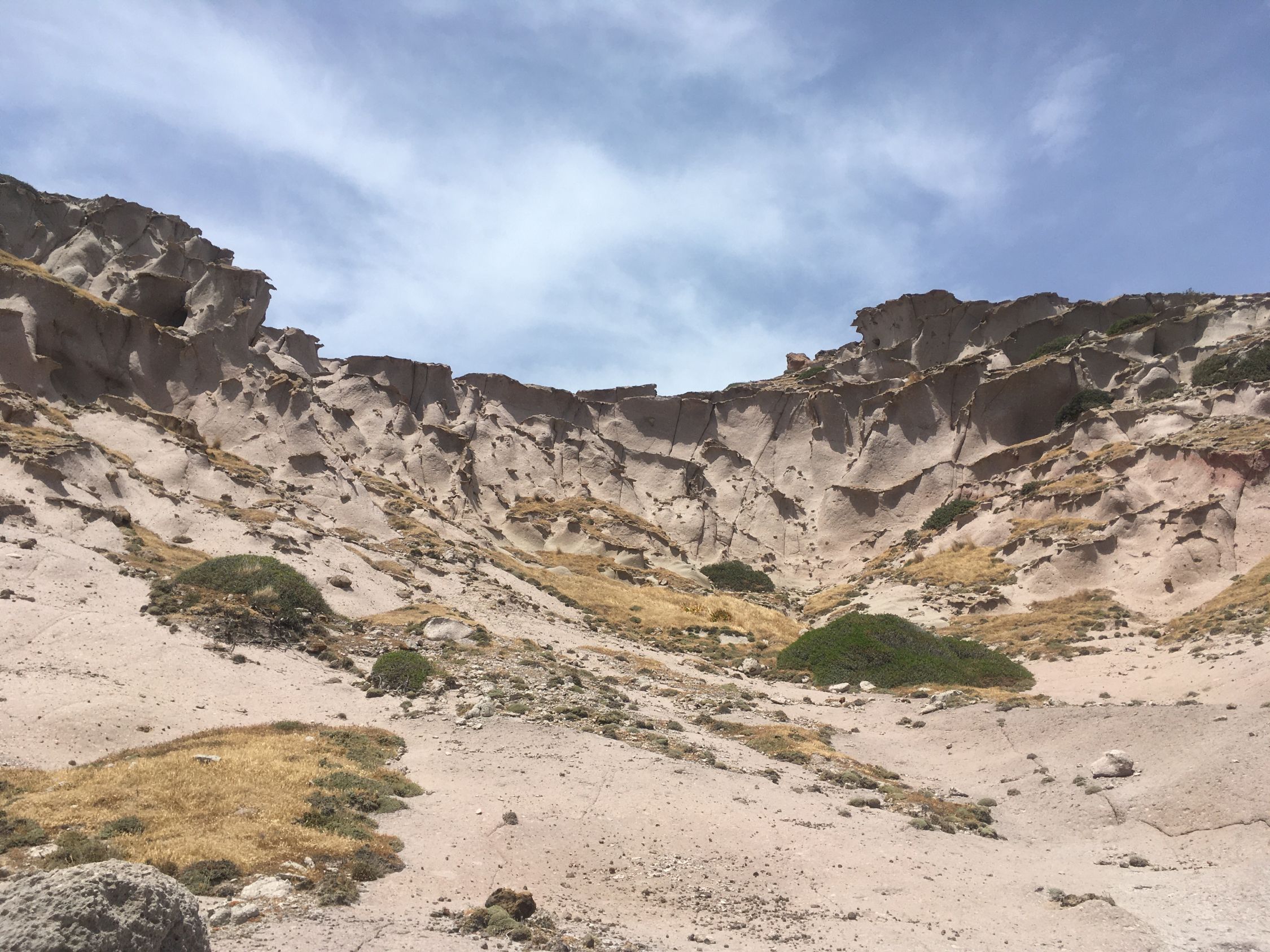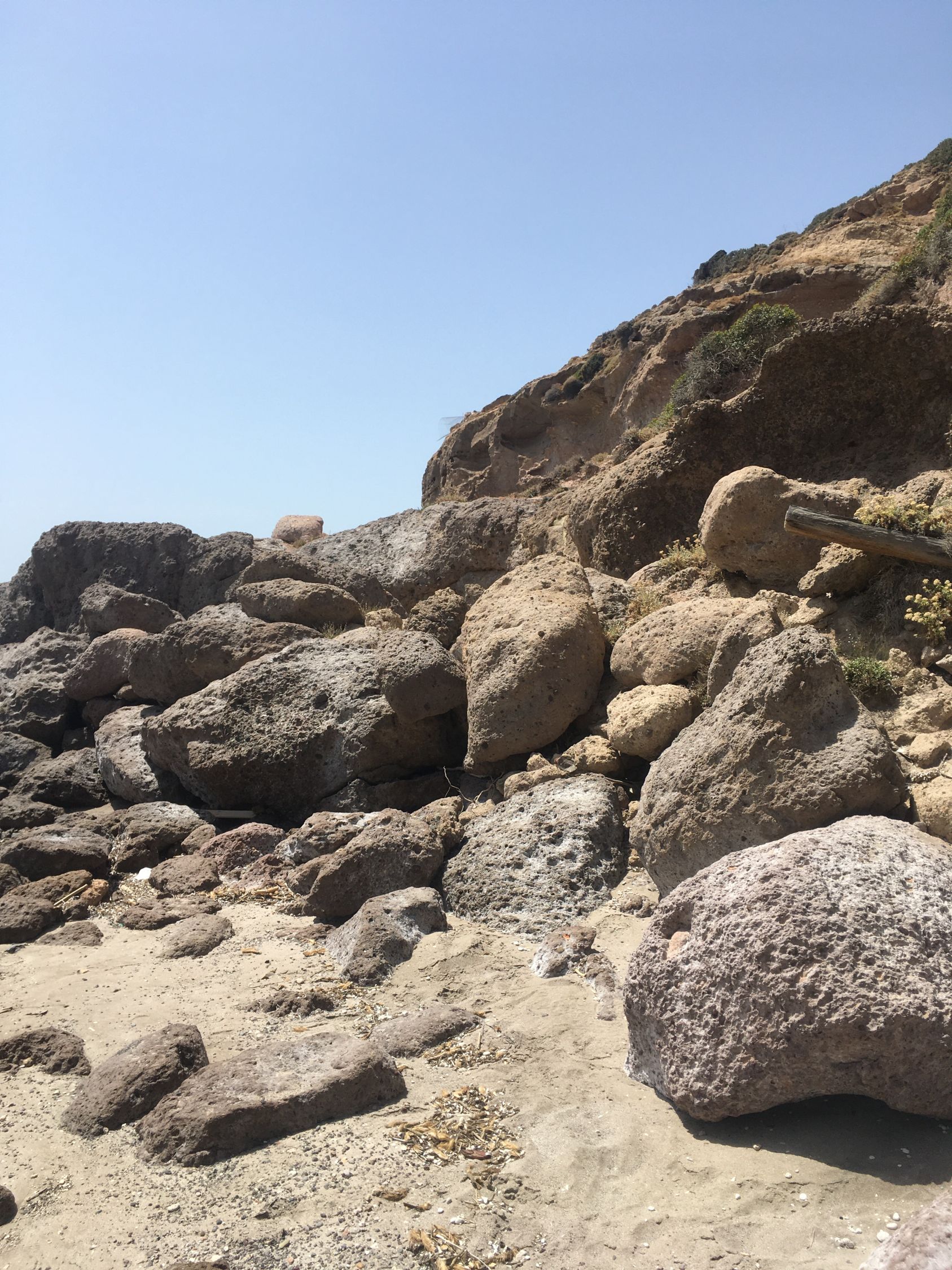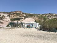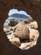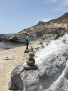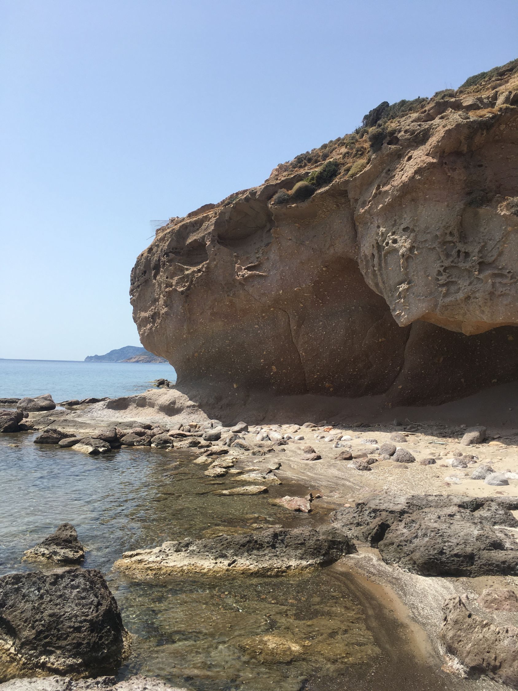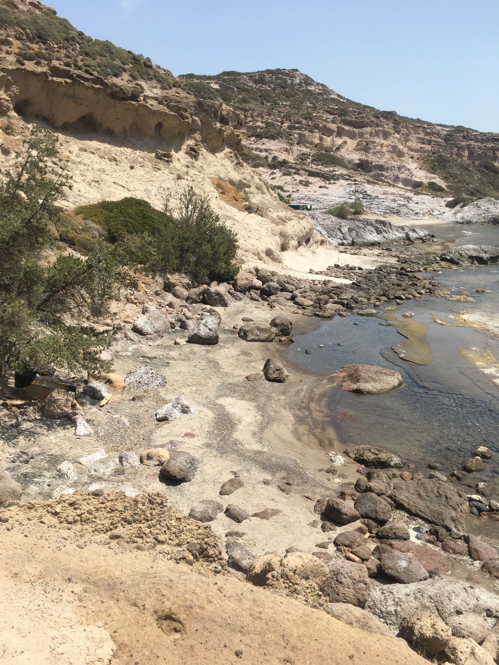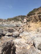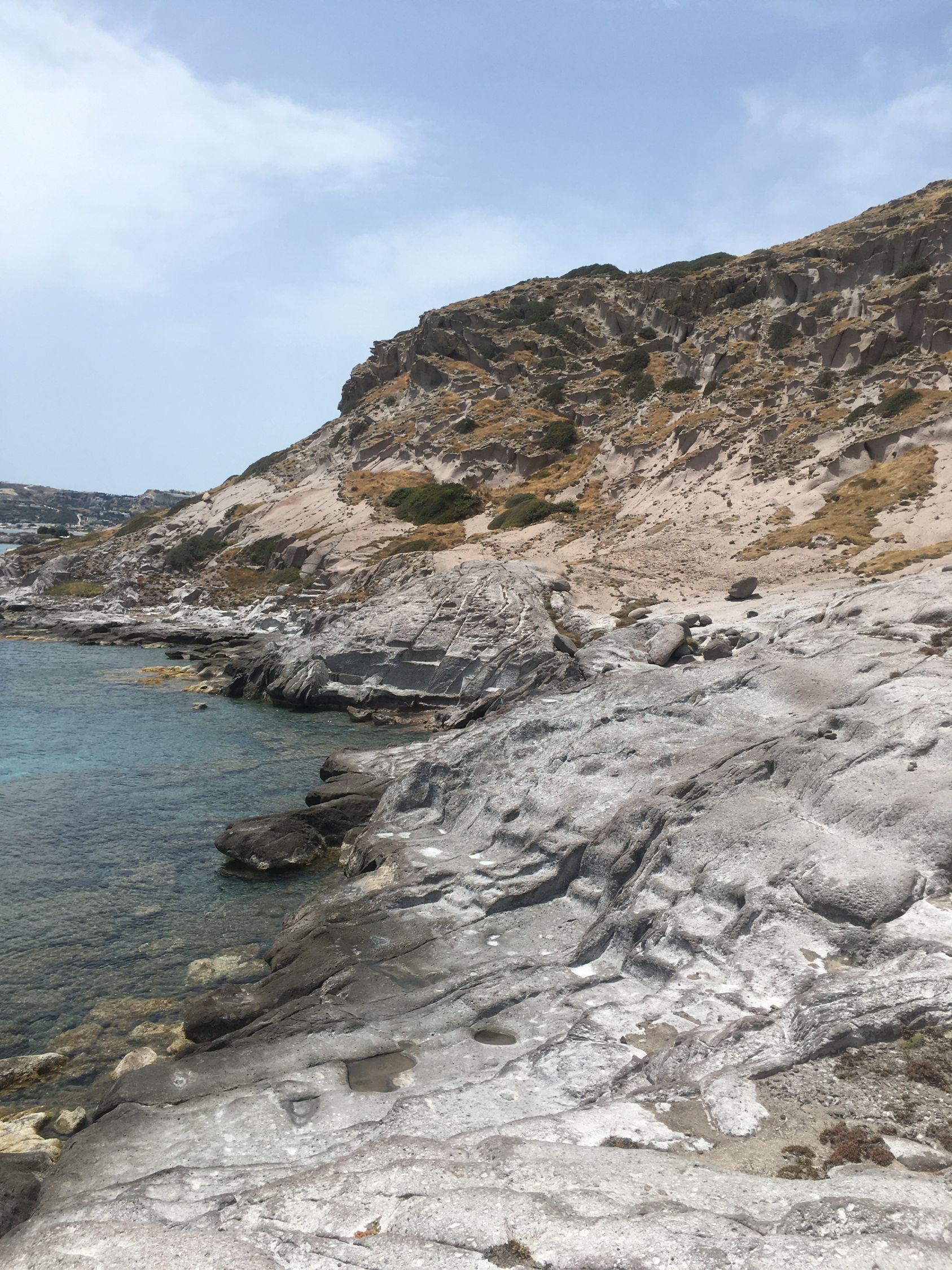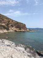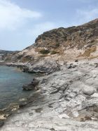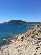 Küstenwanderung zu zwei einsamen Badebuchten Südküste Kefalos Kos (T4-). Start Jenny Taverne oberhalb Camelbeach, 20 Grad, windstill. Die Schlüsselstelle nach der heruntergekommenen Badebucht (hier war mal Parkplatz mit Bistro und Sonnenschirme) mit Kletterstelle und weiter unschwierig zur schönen und einsamen Badebucht unterhalb Panorama Studios mit schönem Sandstrand und ruhigem Meer. Nach einem erfrischenden Bad, Wasser ca, 20 Grad, weiter zum grossen Strand nähe des ausgezeichneten Restaurants Katerina.