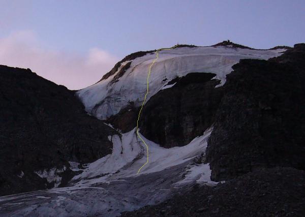 Am besten früh (5 Uhr) einsteigen (dadurch Schneebrücken über Spalten stabiler). Ansonsten wohl eher im Mai/Juni zu empfehlen, es sei denn, man will sich eine Gletscherdusche in der Rinne gönnen :).