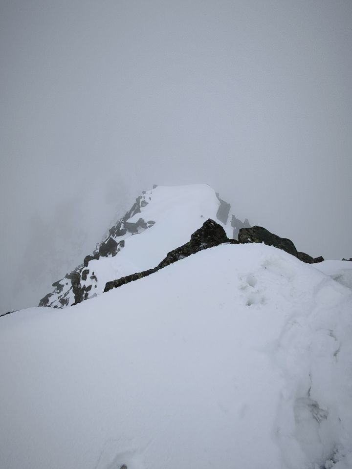 Bewölkter Himmel am Start um 7Uhr. Abstrahlung war trotzdem noch ok. Steilstufe wäre ohne Harscheisen gegangen. 100hm unterhalb des Skidepots viele Spitzkehren zwischen den Lawinenkegel machen müssen. Aufstieg zum Gipfel noch ohne Spur. Mentale Herausforderung da es links und rechts gewaltig das Loch runter ging mit senkrechten abdrängenden Schneewänden. Die Kletterei am festen Fels war noch der entspannende Part. Danke René für den gegenseitigen mentalen Support. Alleine wäre ich heute nicht hoch gegangen. Abfahrt oben auf griffigen harten Schnee wo es sich sehr gut carven ließ. Auf der Abfahrt gar paar Schneeflocken von oben. Von den vorausgesagten 7 Std Sonnenschein gab es ein Zehntel. Auser wir 2 war niemand auf dem Gipfel.