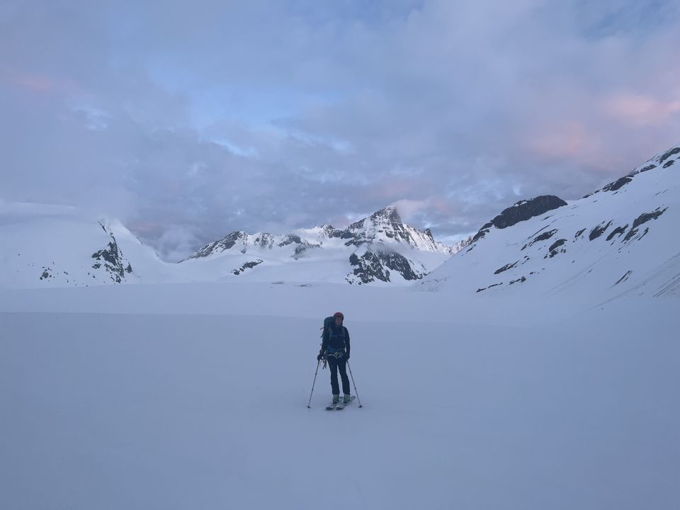 Start um 5:15 von der Finsteraarhornhütte. Gletscher top eingeschneit und gute Spur bis Galmihorn, dort um 8:20. leider ist es genau nach 5 Minuten am Gipfel komplett zugezogen. Sind daher mit 20 anderen bis 3000m im Whiteout mit GPS gefahren. Danach 400hm tragender Deckel und anschliessend Bruchharsch, mit Board kein Problem. Man kann bis 1964 Challier fahren, danach 1h Fussmarsch. Waren wegen Blindflug um 10:50 in Reckingen.