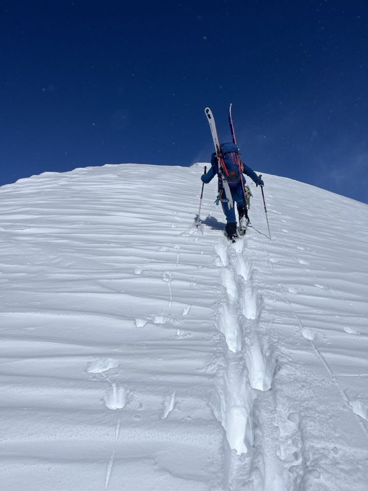 Spalten zu, sonnig.Relativ viel Schnee. Alle Schneearten. Abfahrt. direkt vom Gipfel