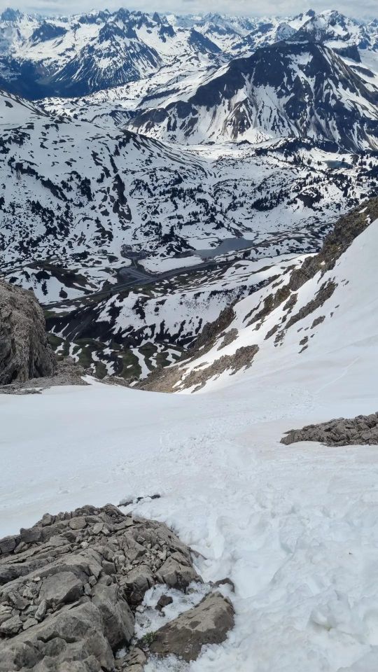 Vom Parkplatz am Hochtannbergpass bis zum Einstieg der Rinne müssen zunehmend öfter Schneefelder überwunden werden, In der großen Rinne ist durchgehend noch viel Schnee, jedoch mir hohen Schuhen und Gamaschen kein Problem. Schnee ist angetaut und sulzig schwer. Links der Rinne kann öfter auf Fels für den Aufstieg gewechselt werden, bis etwa zur mittleren höhe, von da an ist nur noch das Schneefeld da. Kurz vor dem Gipfel stehen wieder Felsen zur Verfügung.