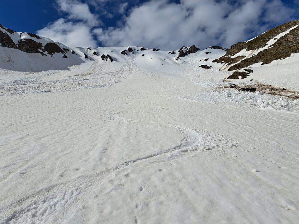 Abfahrt zuerst dem grat nach. Queren und in schönem Sulz bis 2000m