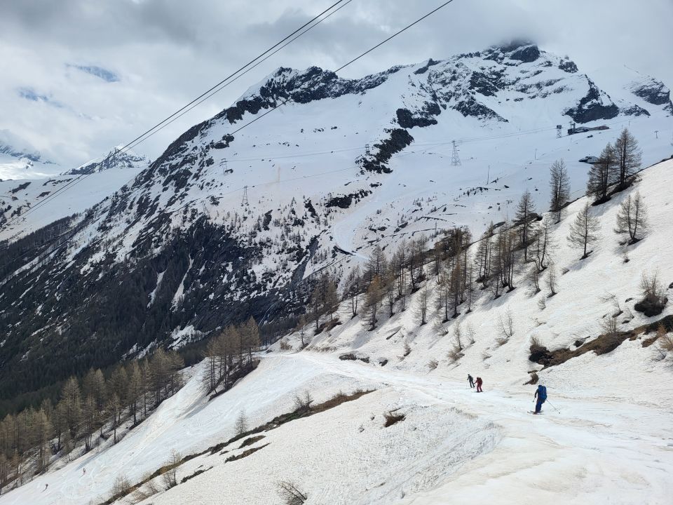 Wir sind um 5 Uhr bei der Täschhütte gestartet. Oberhalb der Hütte hat es noch genug Schnee, so dass man direkt mit den Skis loslaufen kann. Der Schnee war hart gefroren, so dass Harscheisen im ersten Teil hilfreich sind. Die beiden Steilstücke oberhalb 3500m sind gut ohne Harscheisen passierbar. In der Querung vom Alhubeljoch war es sehr warm und der Schnee von der Sonne aufgeweicht (klebrig). Der Gipfelhang war um unteren Teil sulzig und im oberen Teil pulvrig, aber der Aufstieg mit den Skis gut machbar.