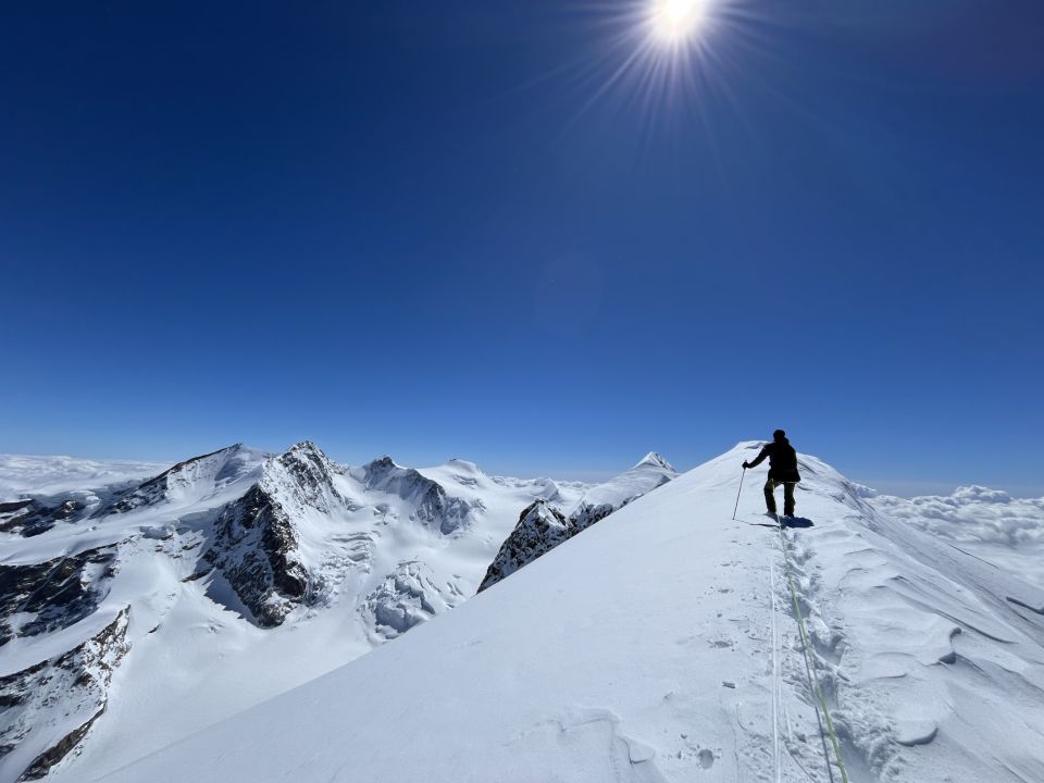 Der Grat musste ab Skidepot gespurt werden, daher war es stellenweise recht anstrengend sich durch den Schnee zu wühlen. Der Steilaufstieg vor dem Vorgipfel ging gut, gerade hoch im Trittschnee ohne blanke Stellen (im Abstieg rückwärts runtergepickelt).