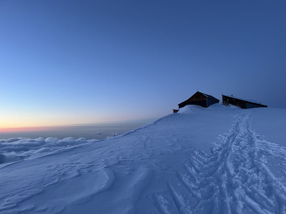 Übernachtung in der Quintino Sella Hütte. Infos zum Winterraum: ca 25 Betten mit Decken, kleine Küche mit Ofen und 2 Gaskochern (viel Holz und grosse Gasflasche vorhanden), Toilette in der Hütte.