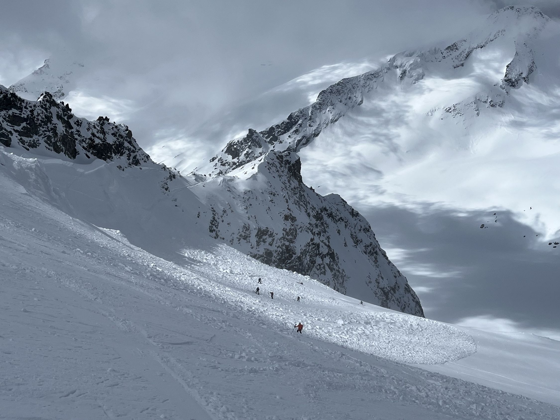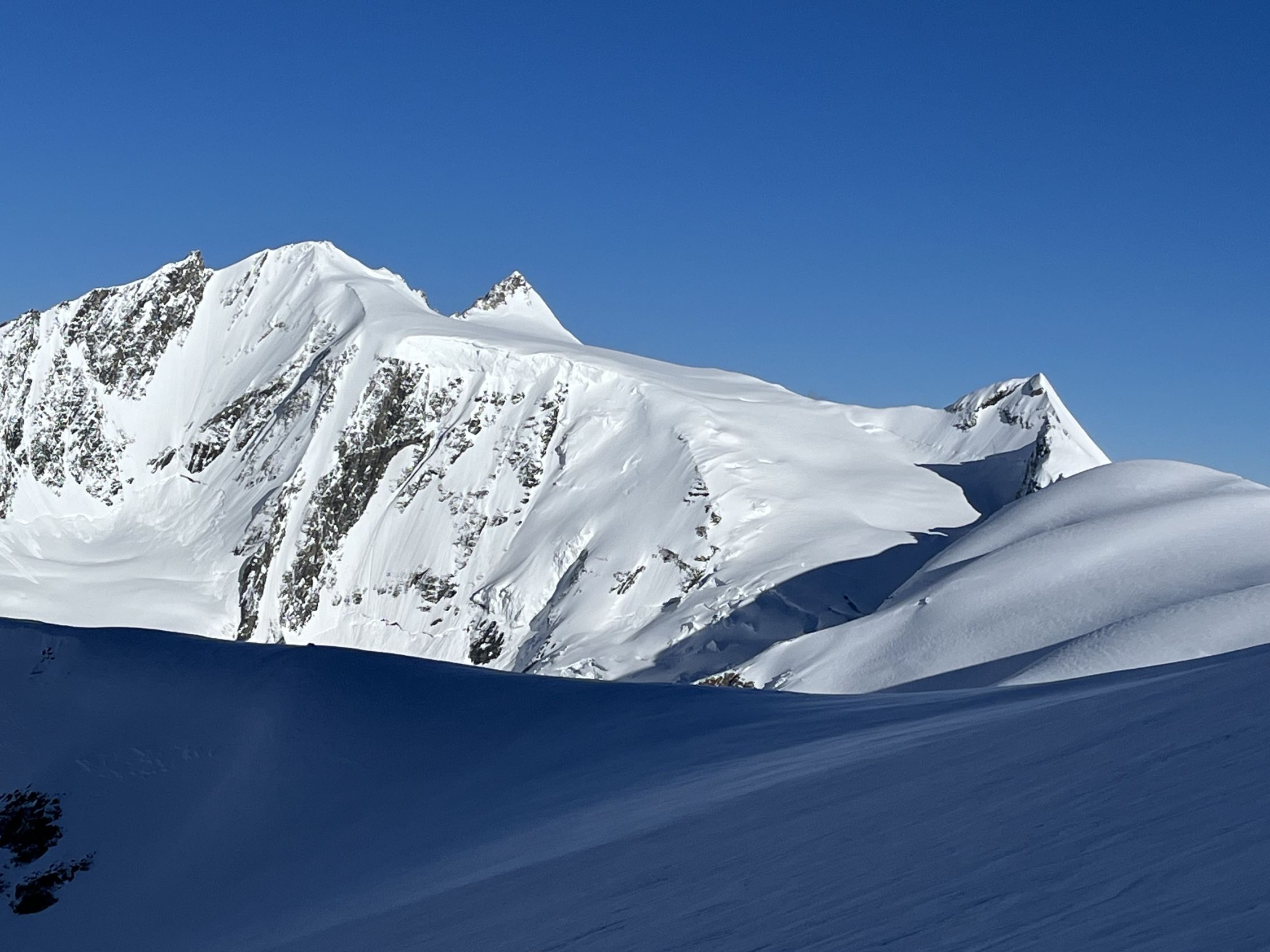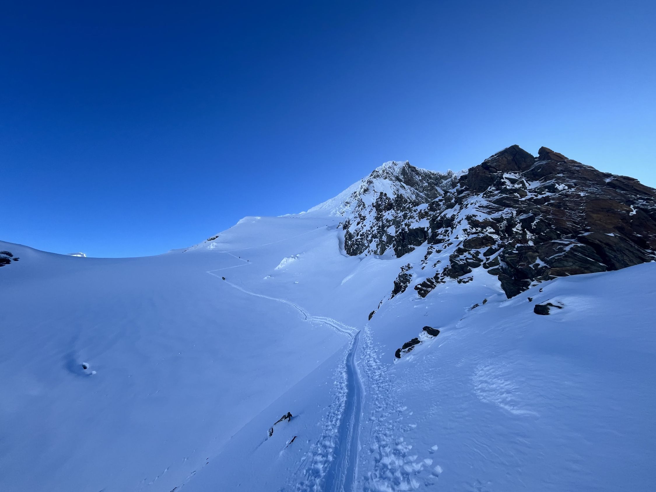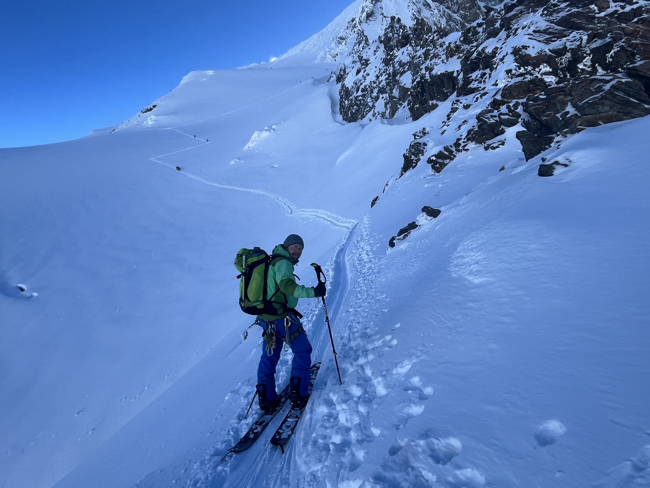 Achtung! In der Abfahrt um 10:00 wurde an der Querung P. 3616 eine Lawine ausgelöst die die Aufstiegspur wegspülte, 3 wurden verschüttet ohne Schaden und konnten sich selbst befreien, auch Dank Airbag. Die 2 Personen sind parallel neben mir gefahren, im eingeblasenen Hang, siehe auch persönliche Bilder der Querung. War zu viel Belastung im Hang in dem 60 Leute vorher gequert haben. Unglücklicherweise ereignete sich wenig später noch ein Absturzunfall, mit Verletzung an der Querung - daher Vorsicht bei der Querung ;-)