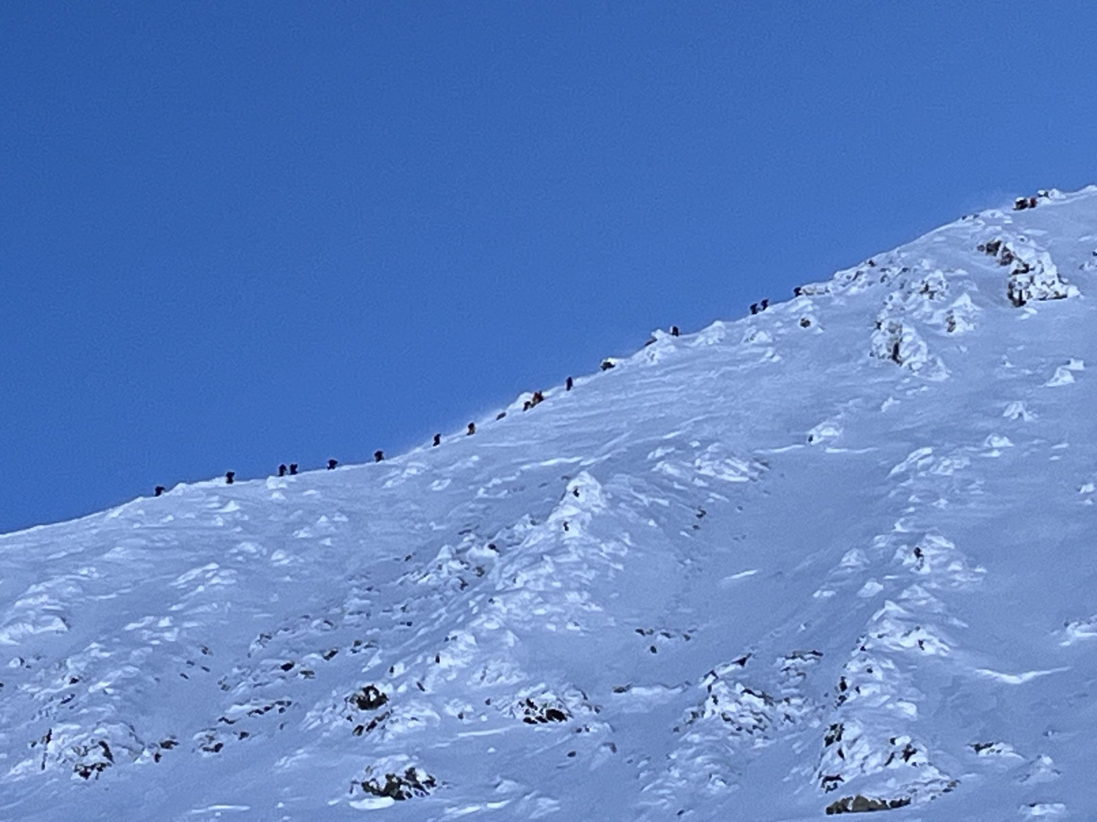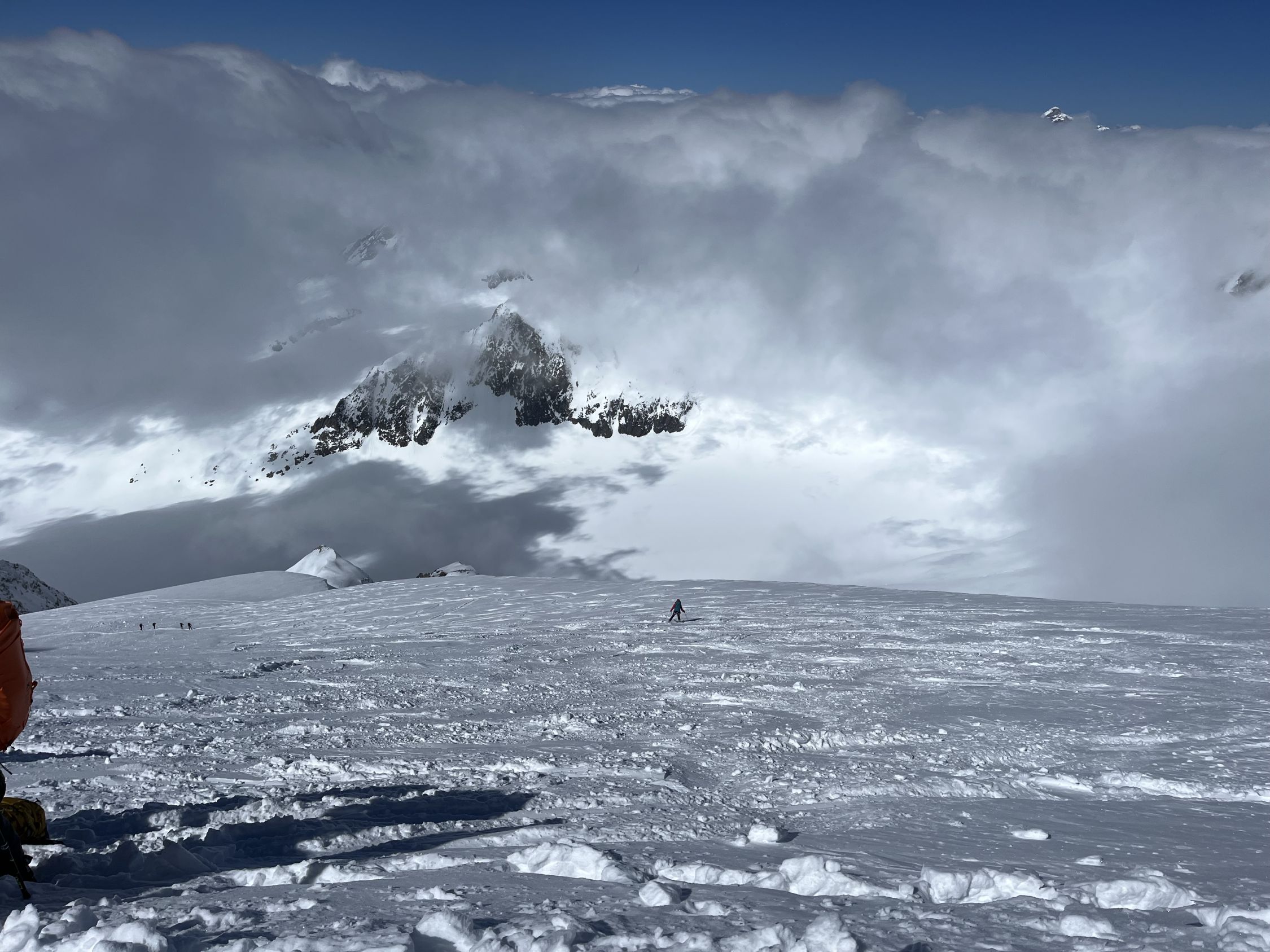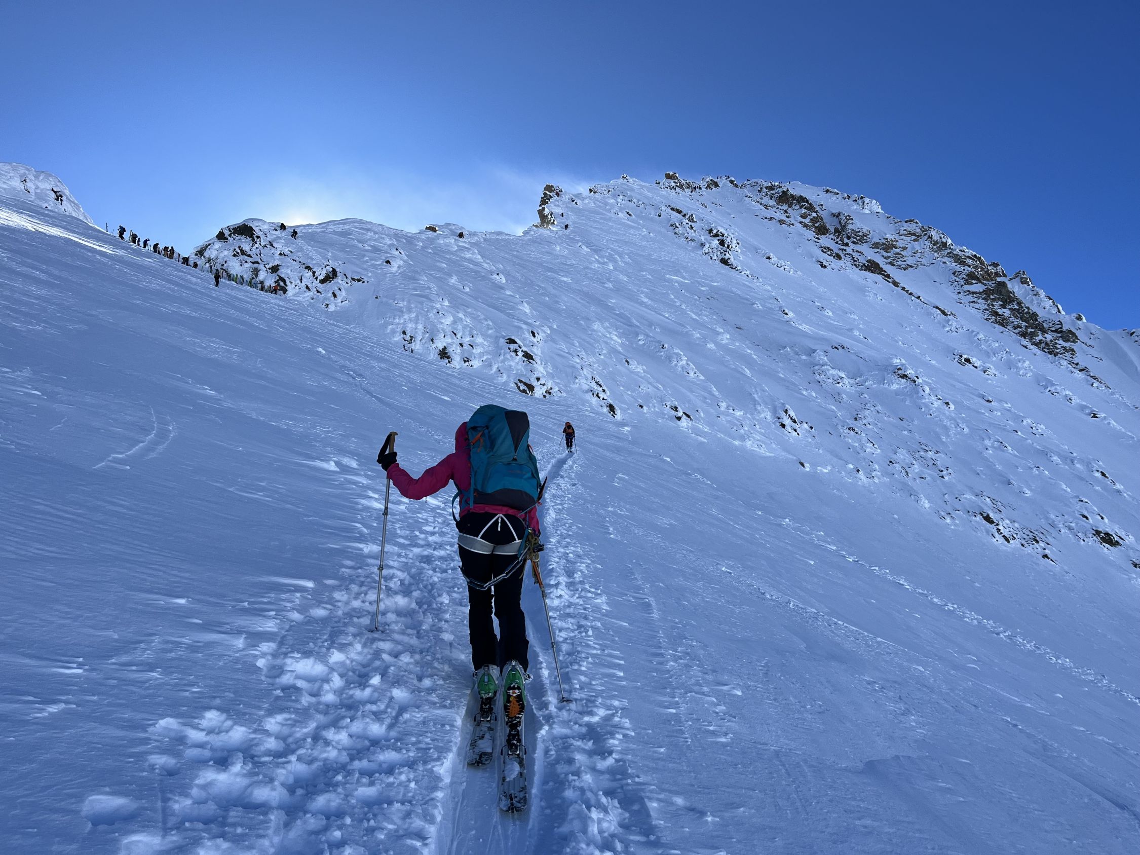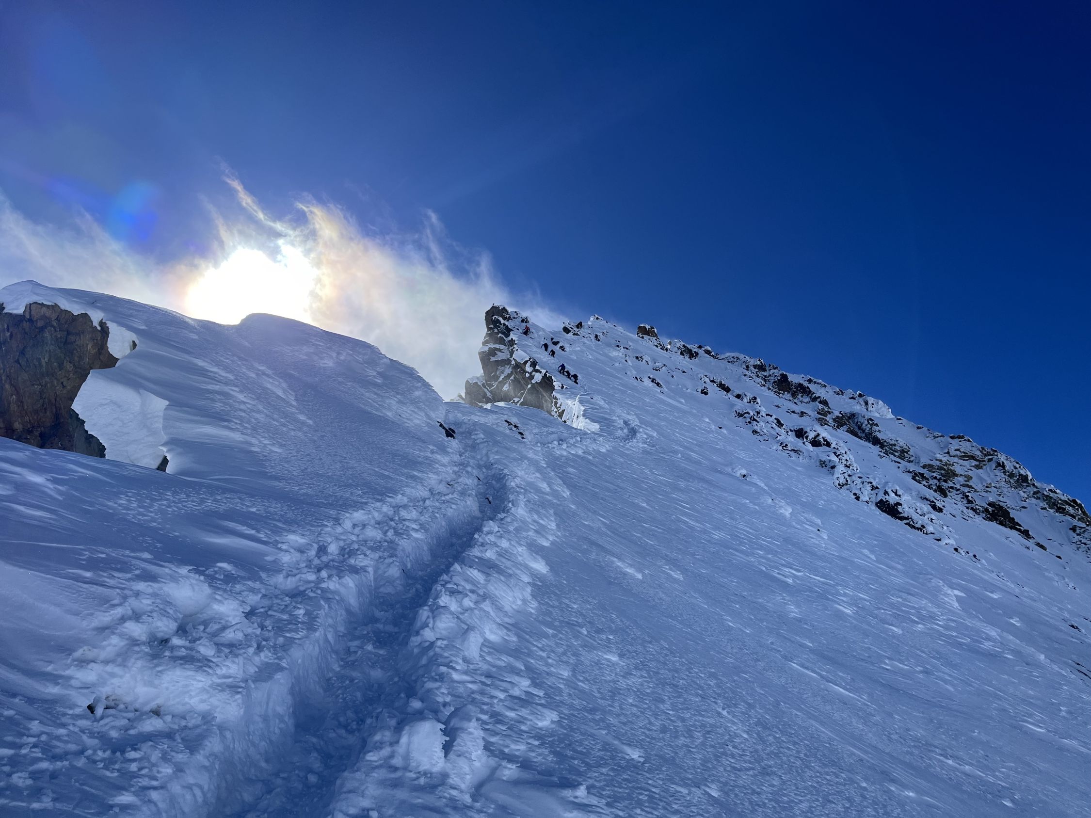 Achtung! In der Abfahrt um 10:00 wurde an der Querung P. 3616 eine Lawine ausgelöst die die Aufstiegspur wegspülte, 3 wurden verschüttet ohne Schaden und konnten sich selbst befreien, auch Dank Airbag. Die 2 Personen sind parallel neben mir gefahren, im eingeblasenen Hang, siehe auch persönliche Bilder der Querung. War zu viel Belastung im Hang in dem 60 Leute vorher gequert haben. Unglücklicherweise ereignete sich wenig später noch ein Absturzunfall, mit Verletzung an der Querung - daher Vorsicht bei der Querung ;-)