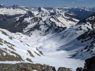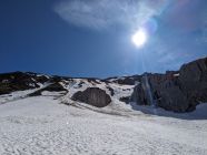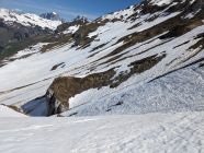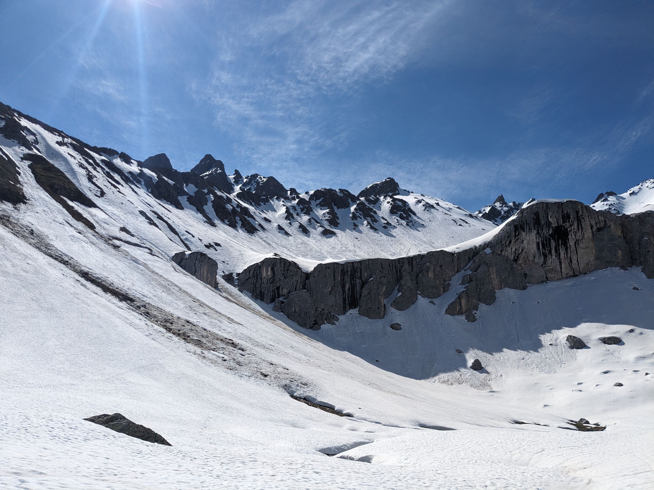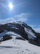 Die Steilstufe am Unghürtschuggen leider aufgrund von Lawinenkegeln und aperen Stellen extrem mühsam mit den Ski, bin dann einfach hochgelaufen, was aufgrund der sehr guten Abstrahlung kein Problem war. Runter geht es zwischen den Felsen ganz gut noch (allerdings ziemlich schmale Spur).
