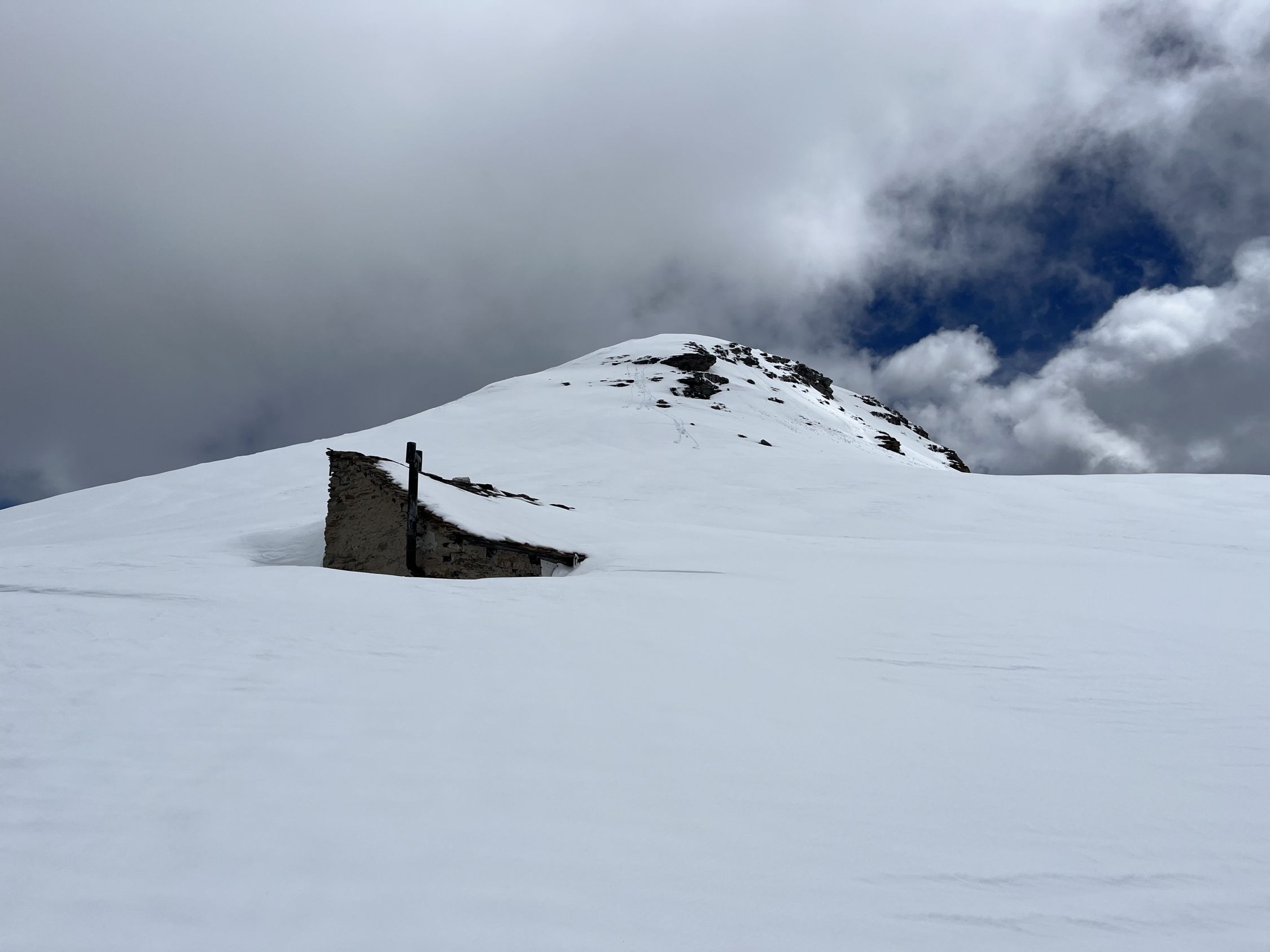 Schnee beginnt im Vallone kurz nach Solcio. Bis etwa 2300 m trägt er recht gut (erkennbar am Saharastaub). Darüber dann neuerer Schnee, der etwas tiefer ist. Alles sehr weich natürlich. Schneeschuhe wären angenehmer gewesen, ging aber auch ohne. Das winzige Bivacco Leoni unter dem Gipfel ist halb eingeschneit, Zutritt nur mit einigem Grabungsaufwand möglich.