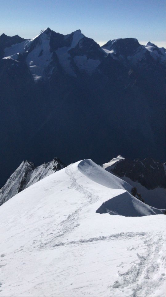 Bis Frühstücksplatz so gut wie schneefrei. Grat trocken danach bester Firn. Randspalte zu!