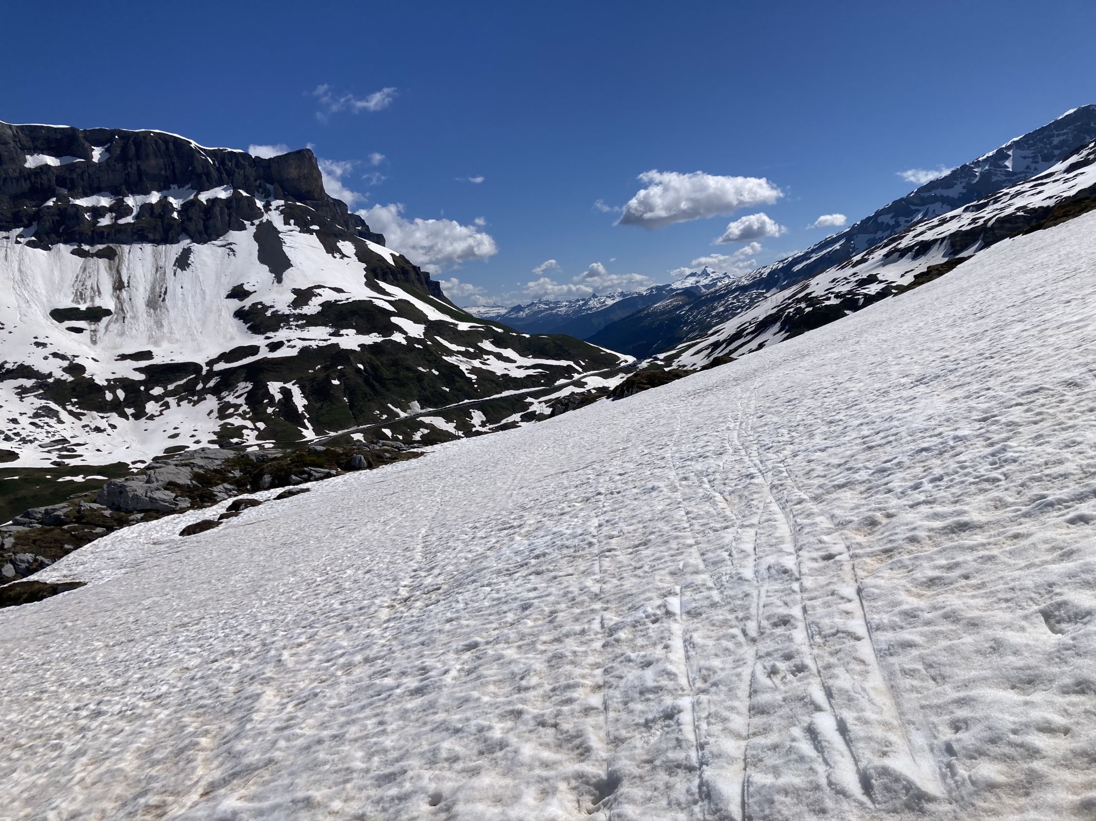Es hat fast durchgehend Schnee ab dem Klausenpass nur an der Stelle in der die Alpstrasse ins Griessstäli biegt sind die Ski kurz abzuziehen.