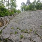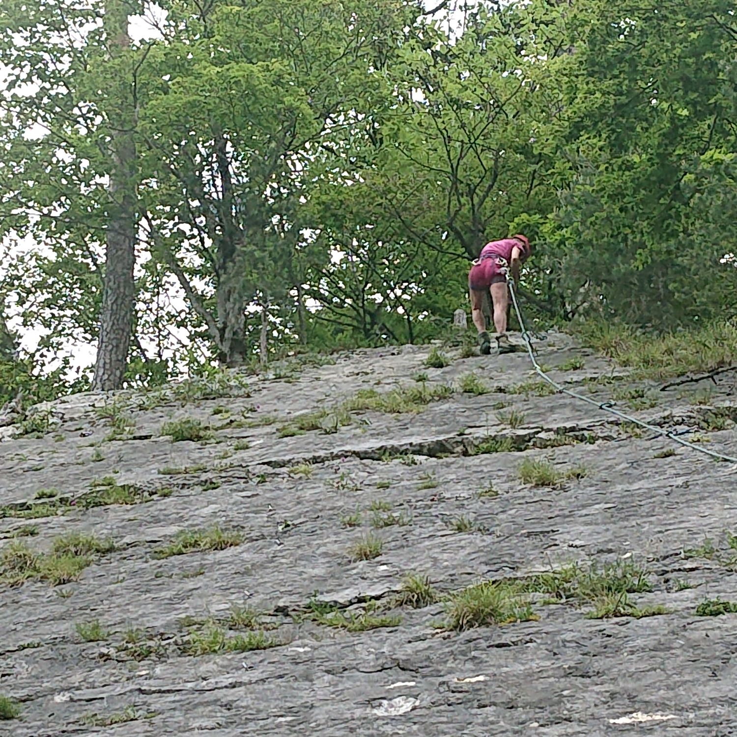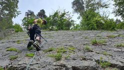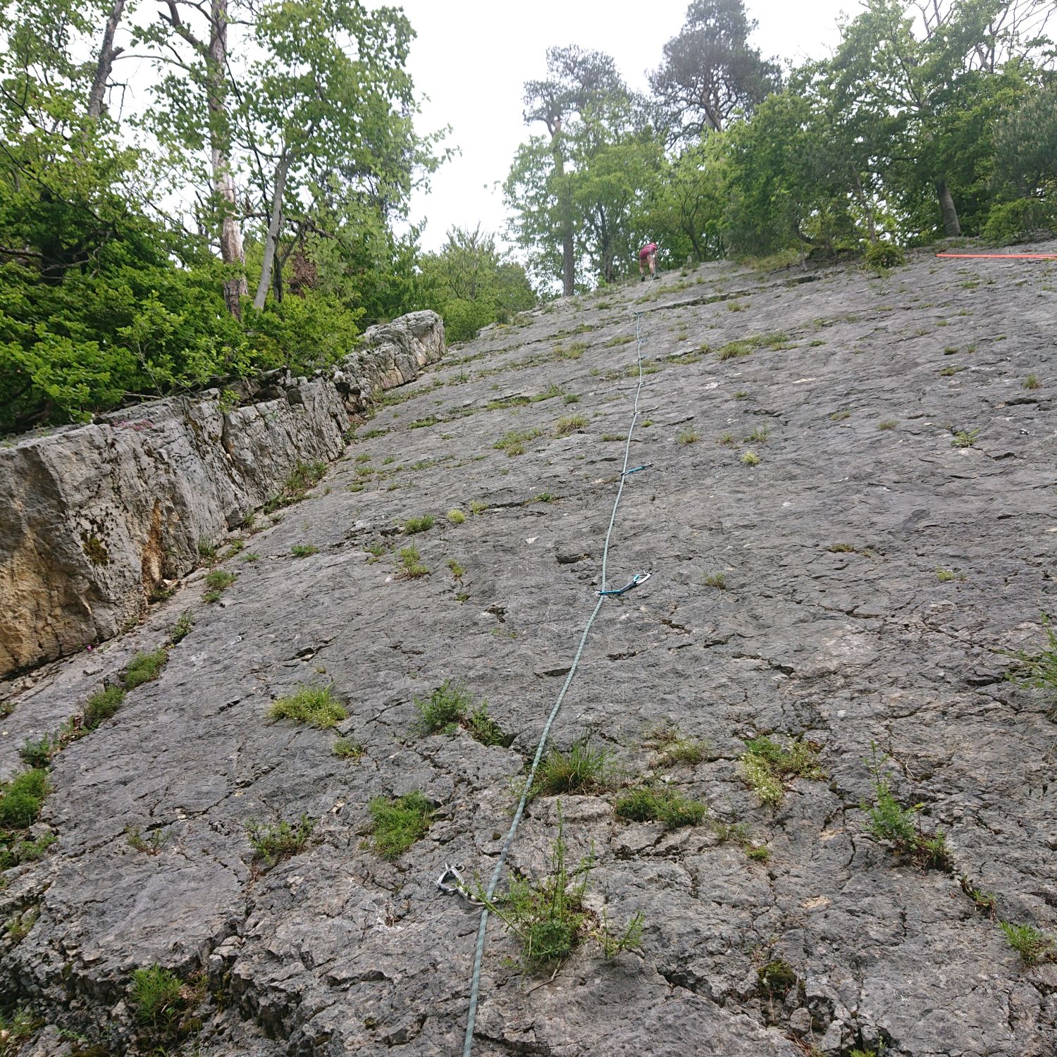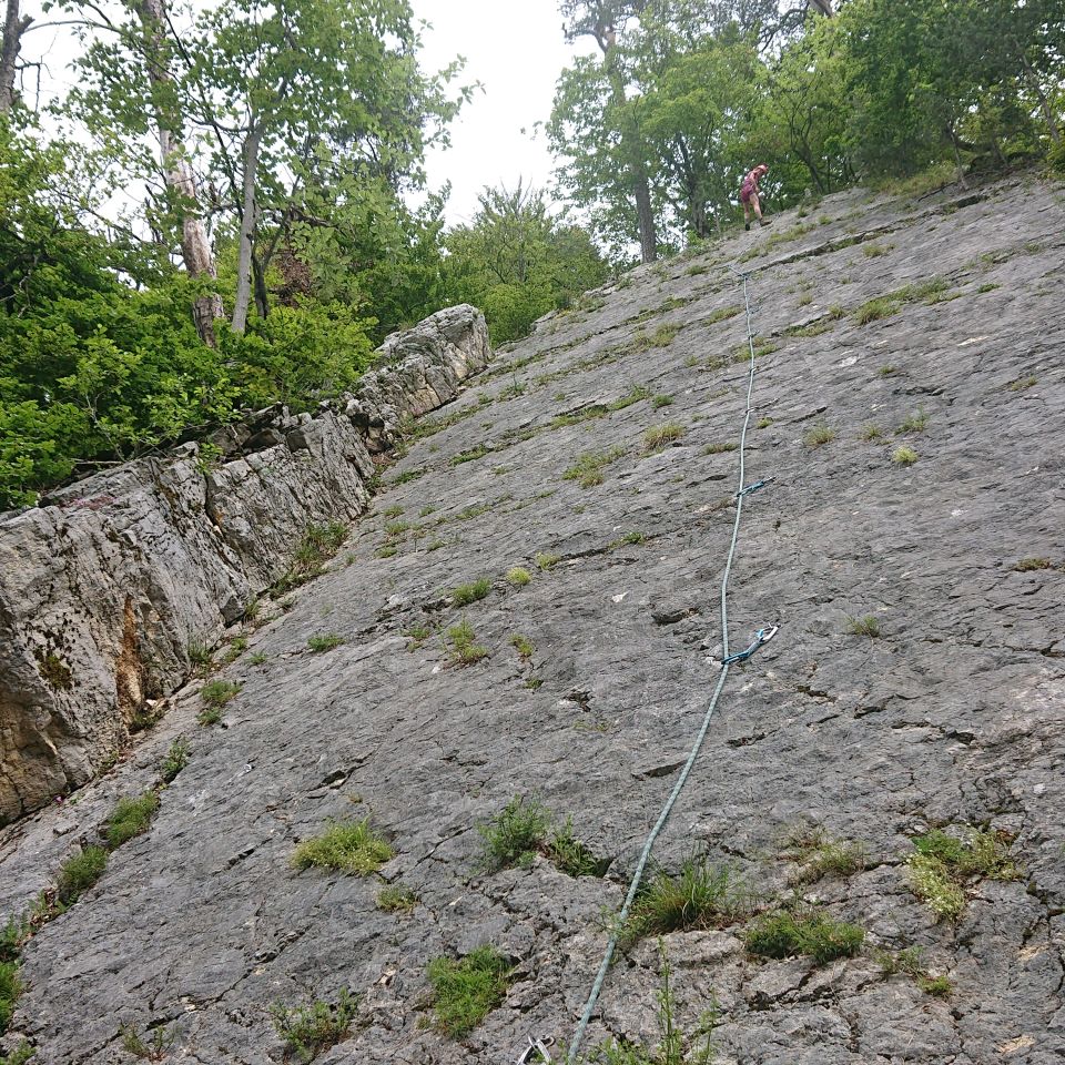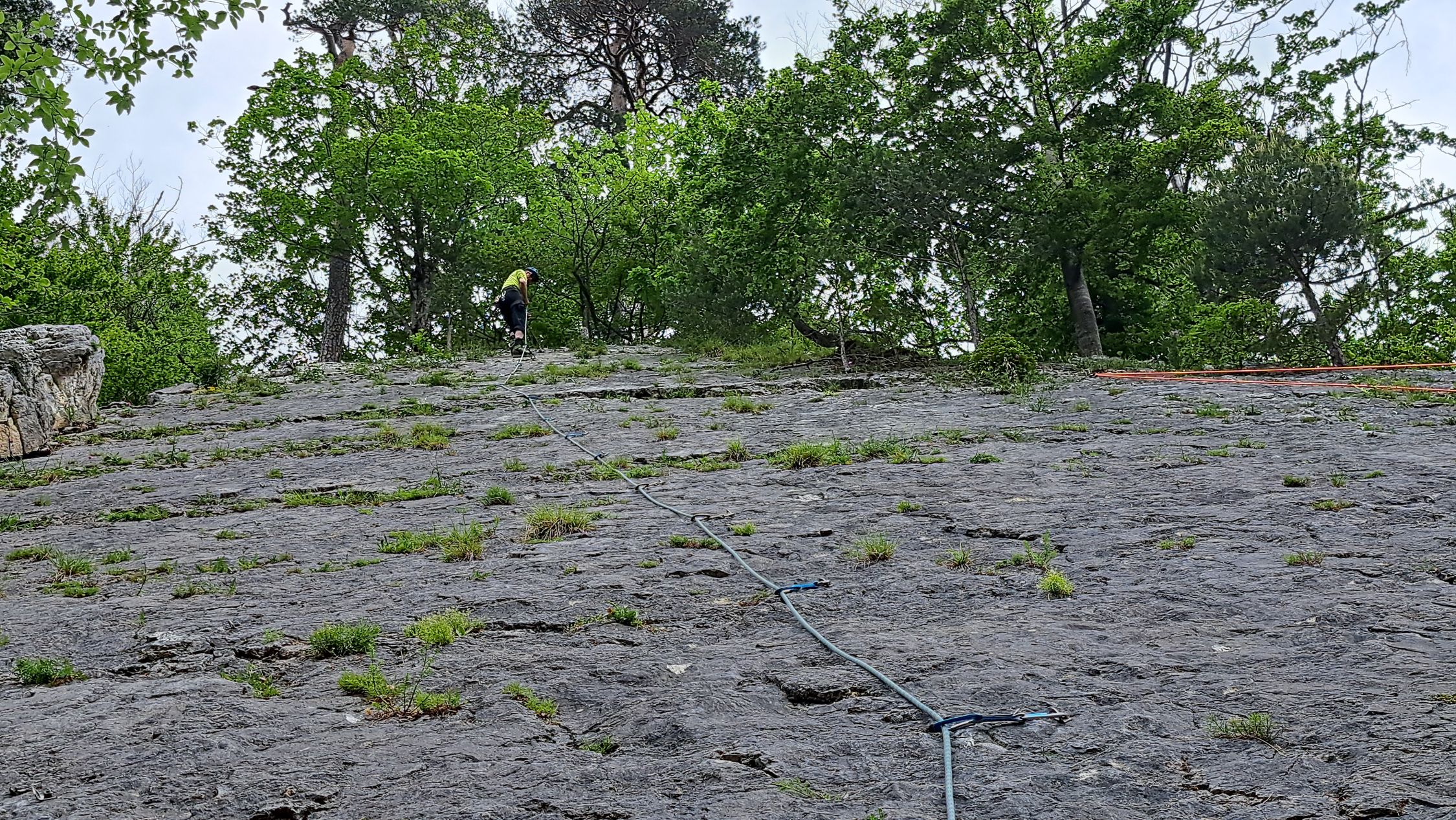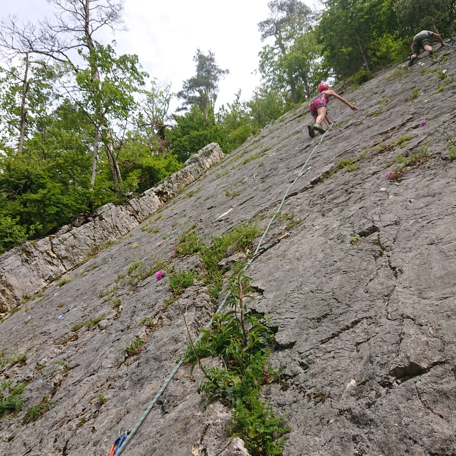 Blanche Neige 5a. Klettern im Jura oberhalb von Soncboz. Die Blanche Neige ist eine ausgezeichnete abgesicherte Plattenkletterei, ruhig im Wald gelegen. Sie bietet eine optimale Möglichkeit die Trittsicherheit zu verbessern.