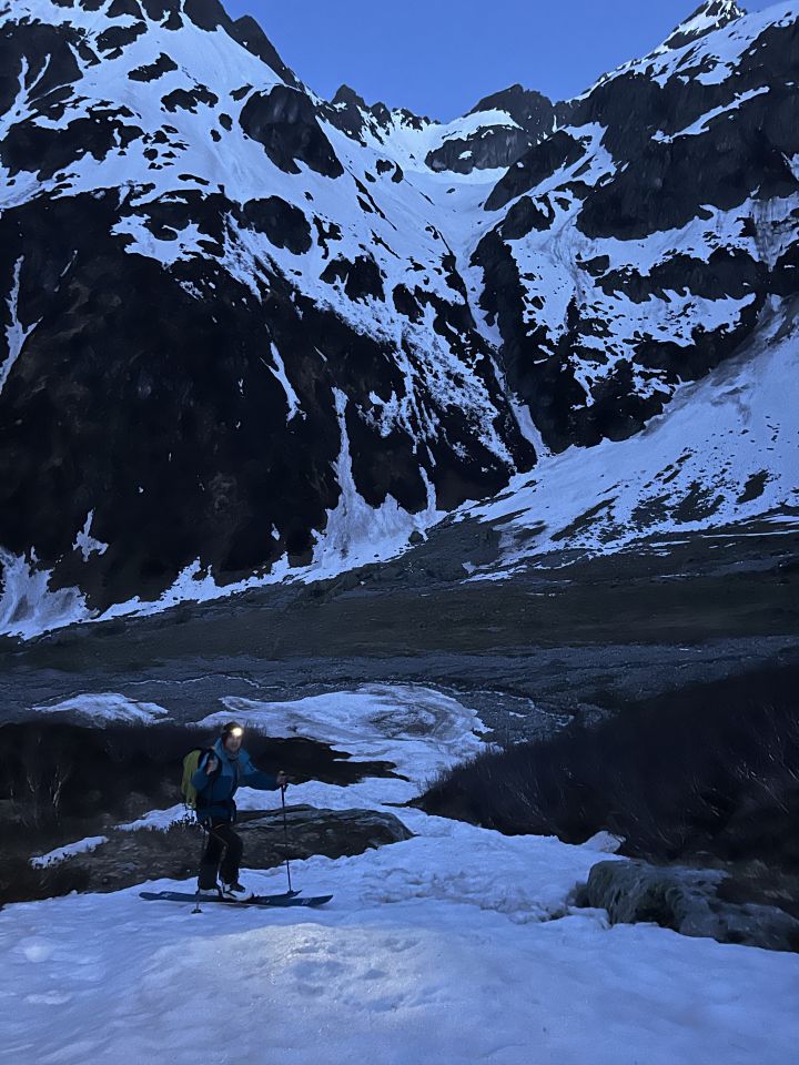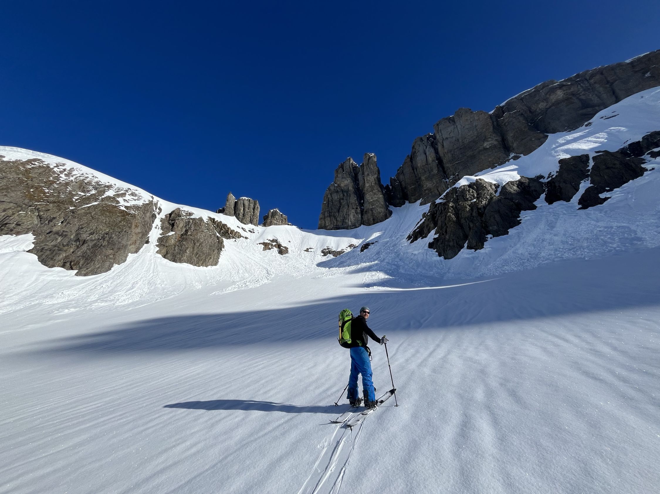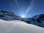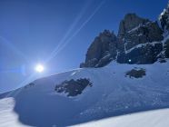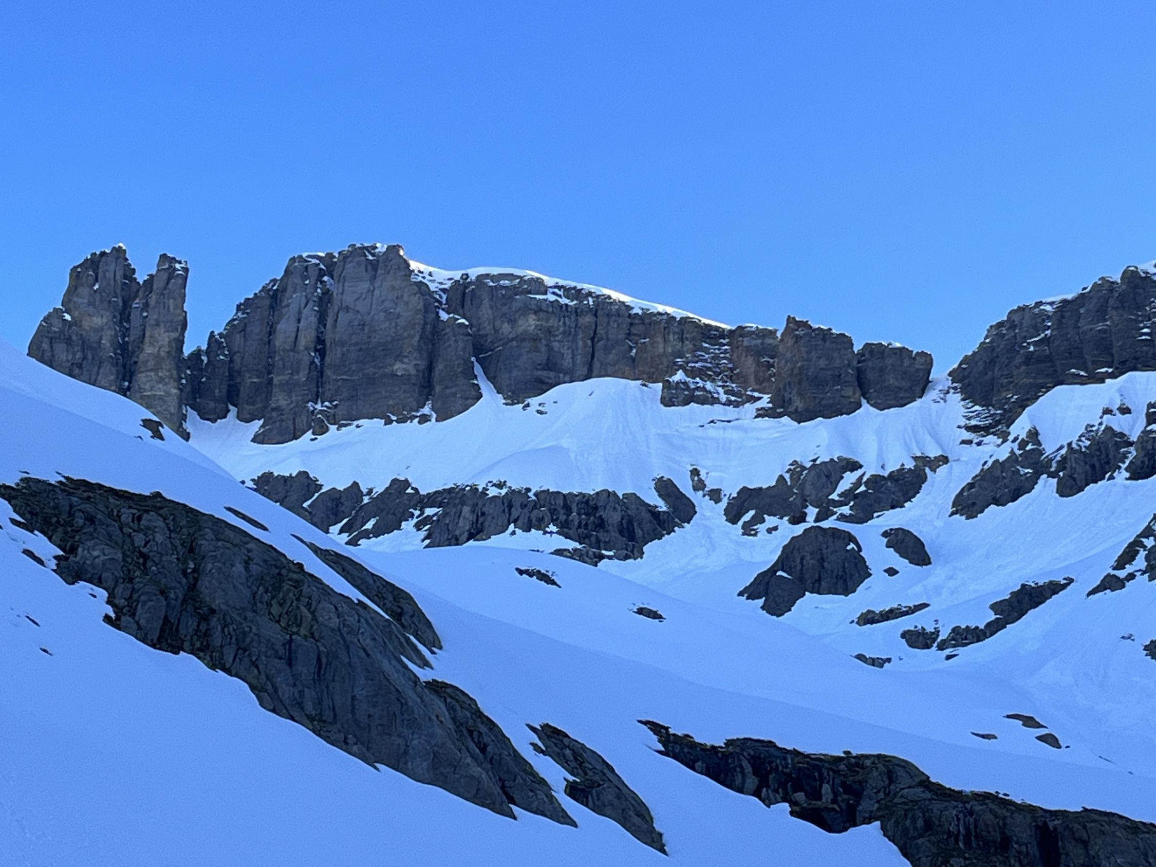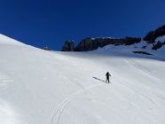 Start um 4:00 von Gorezmettlern Parkplatz. Um die tiefste Schnee/lawinenzunge zu erreichen muss man bis ca. 1750m oder 30. min laufen. Aufstieg entweder mit Steigeisen oder Harscheisen und guten Willen für ca. 300hm - beides mühselig. Danach breite, harte Schneefläche. Ab ca. 2800 leichte Schneeauflage. Leider waren wir erst um ca. 9:15 am Einstieg, Aufstieg war zu Zeitraubend, Schnee der ersten Hälfte der Route entgegen der Nordwandbezeichnung schon voll in der Sonne, Schnee rutschte schon teilweise , auch Auflage auf Fels recht dünn, daher beliessen wir es bei der Inspektion. Spannort wurde auch bestiegen, wenn gefühlt schon zu spät am Tag dafür um 10:00. Sind nachher zum Wintertürmli und um 11:00 abgefahren. Sowohl oben als auch unten dann 2-3 cm aufgefirnt allerdings gleich mit Bremswirkung. Im Osthang unterm Wintertürmli scheint um 7:30 schon die Sonne voll rein, entsprechend ist der Schnee uns um 11:00 bereits nachgerutscht. 1-2h später wird die Menge wahrscheinlich nicht mehr gutmütig sein!