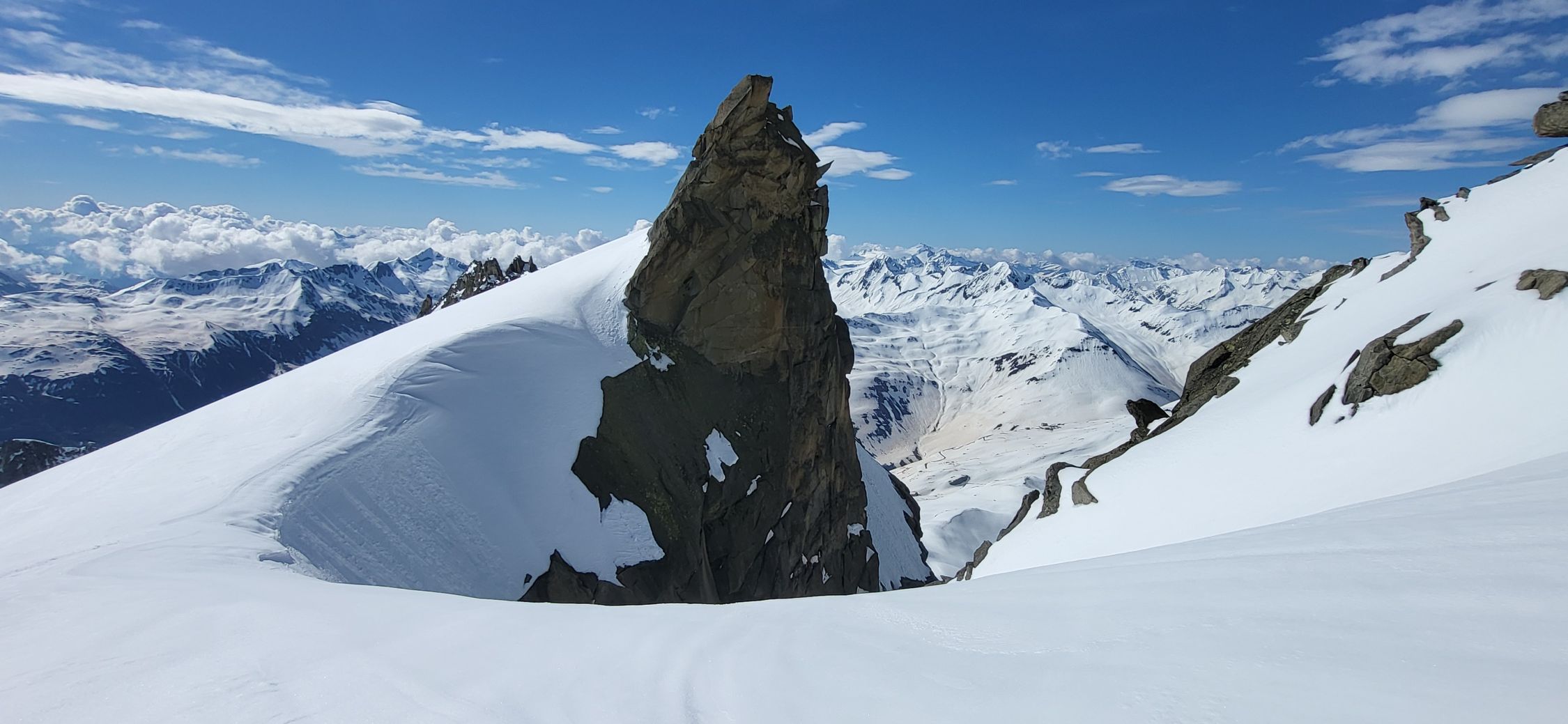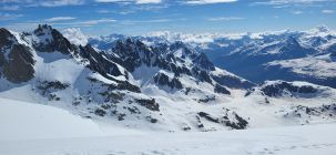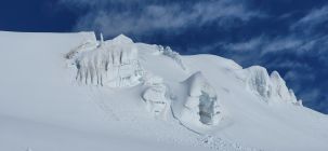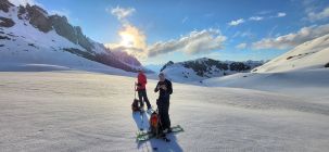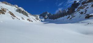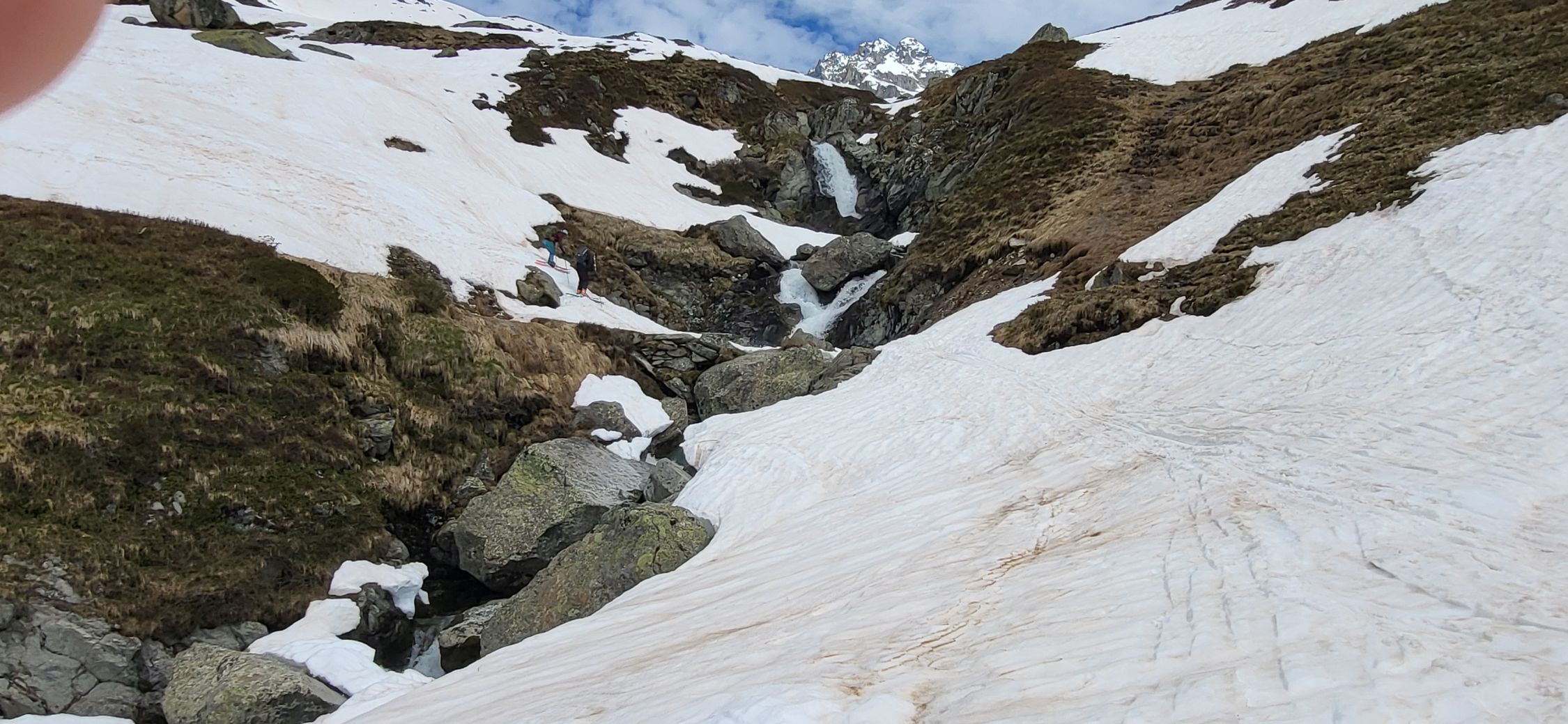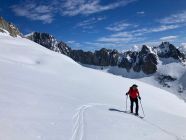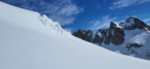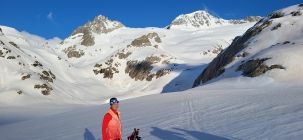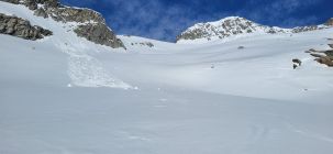 Sonnenschein und erstaunlich gute Schneeverhältnisse. Unten gut verfestigter Altschnee.
