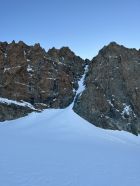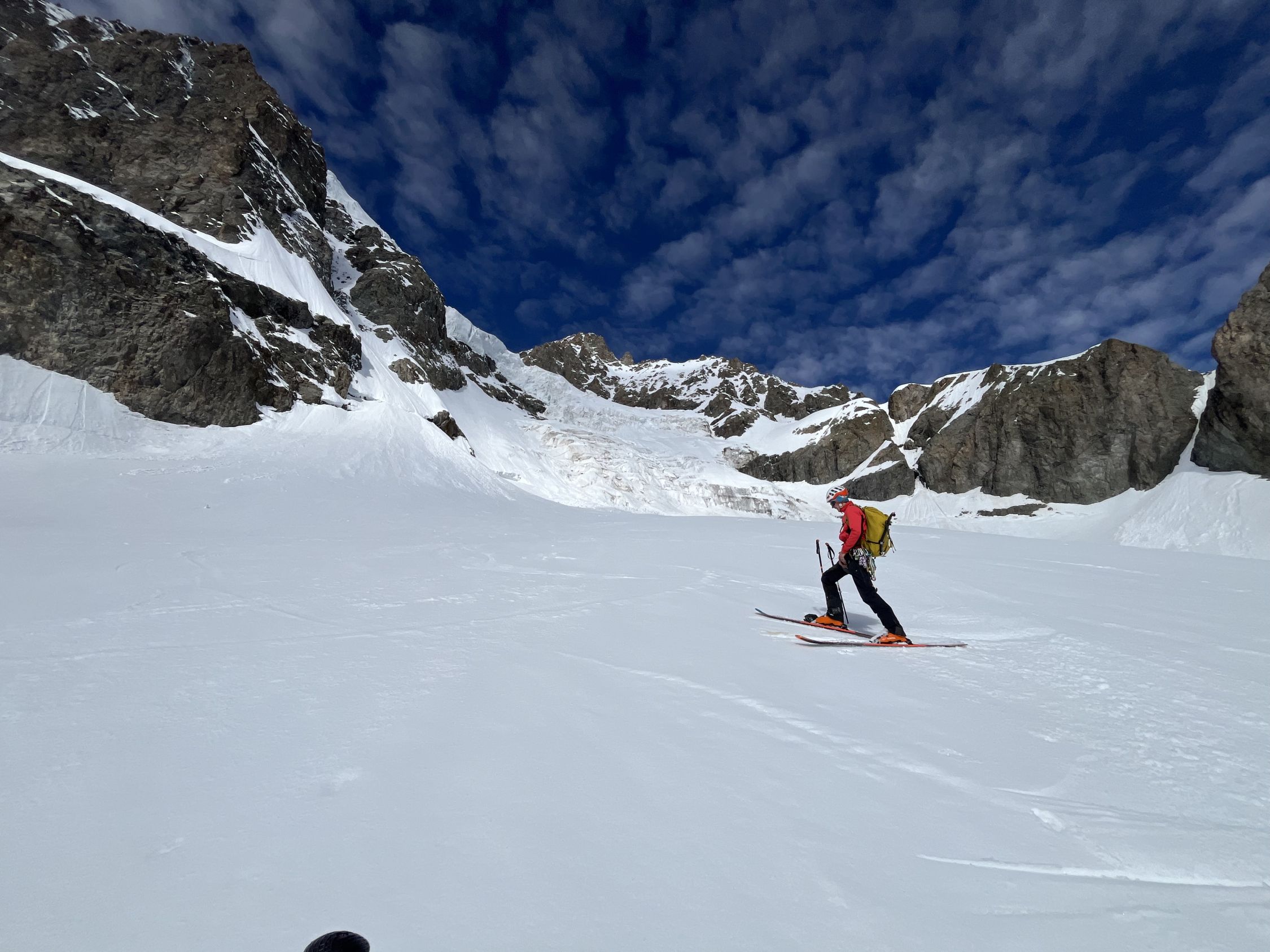 Sehr Gute Verhältnisse im Couloir Mettrier. In der Abfahrt oben hart, dann pulvrig, anschließend Firn und unter 3000m nass. Wir konnten bis 2100m abfahren. Nach 15 min tragen in Richtung Mme Carle kommen nochmal 300Hm abfaht!