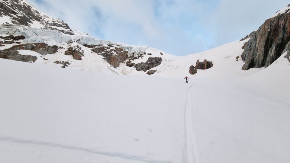 Gletscher war noch zu. Bis 2500m hat es in der Nacht nicht gefroren. Die 2400 steile Stelle war problemlos mit Skis machbar, war aber bei der Rückkehr um 9:30 schon relativ weich.