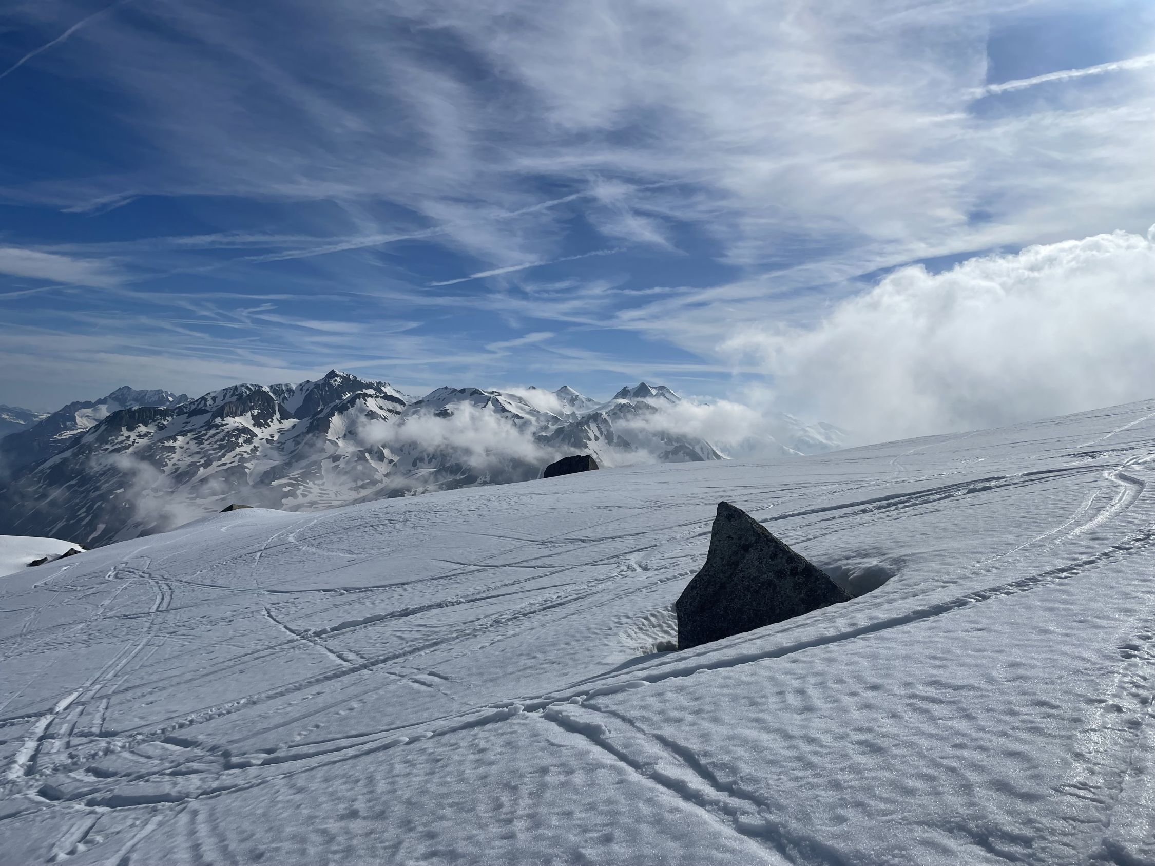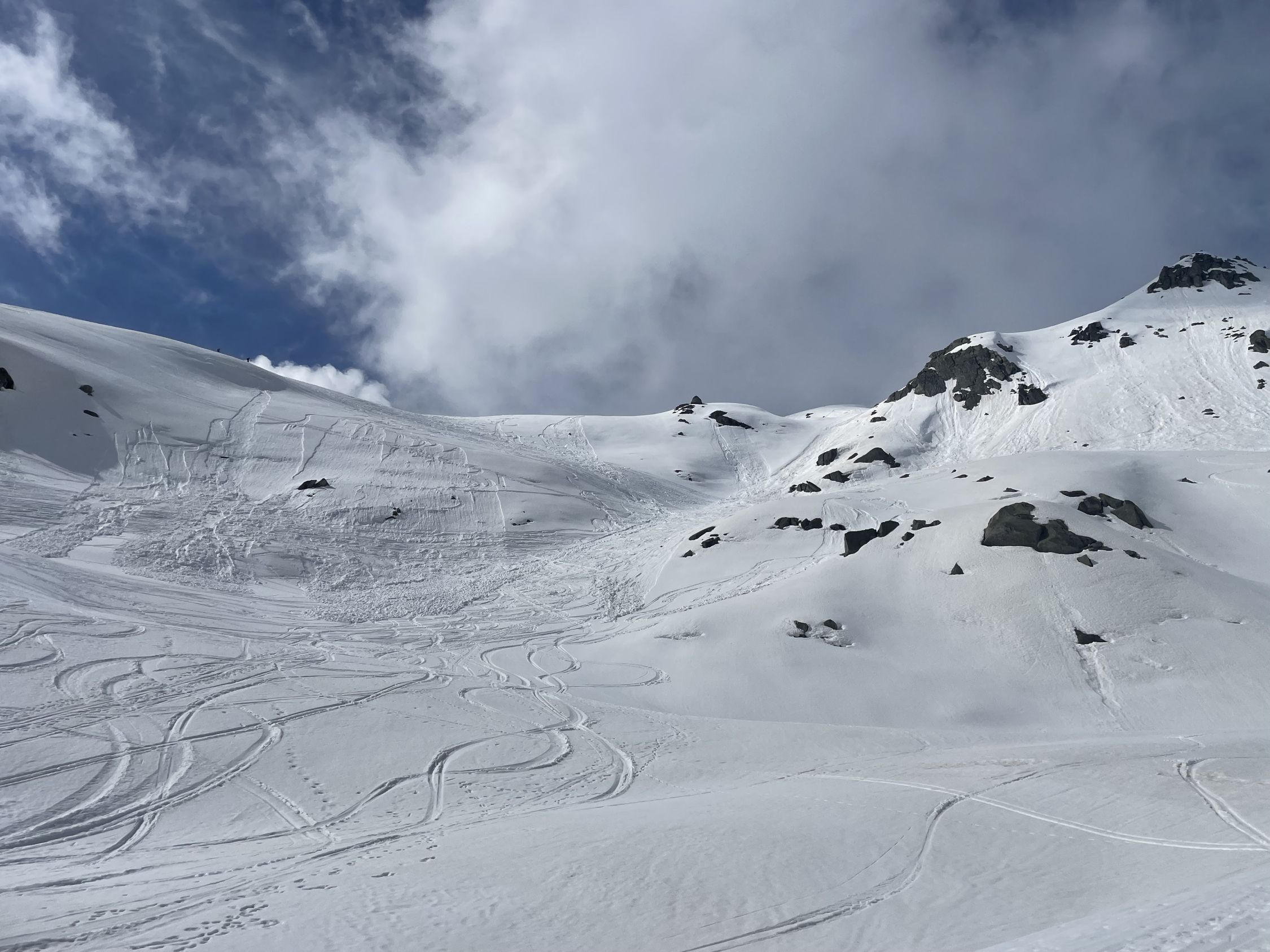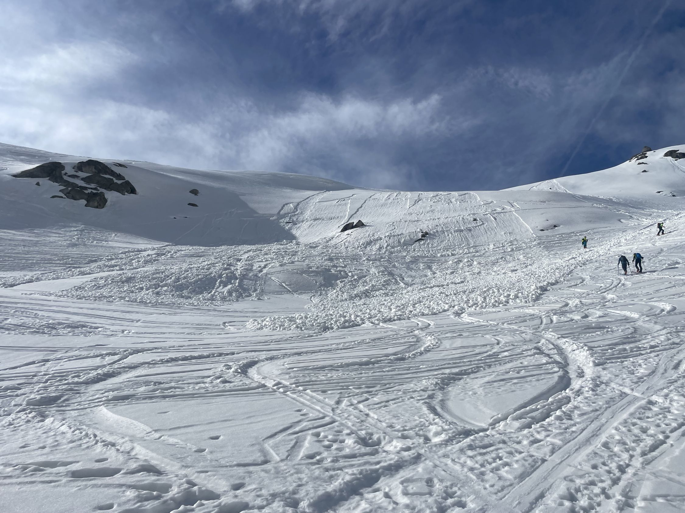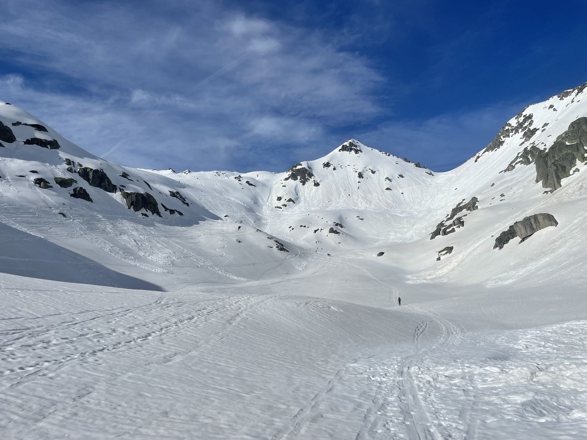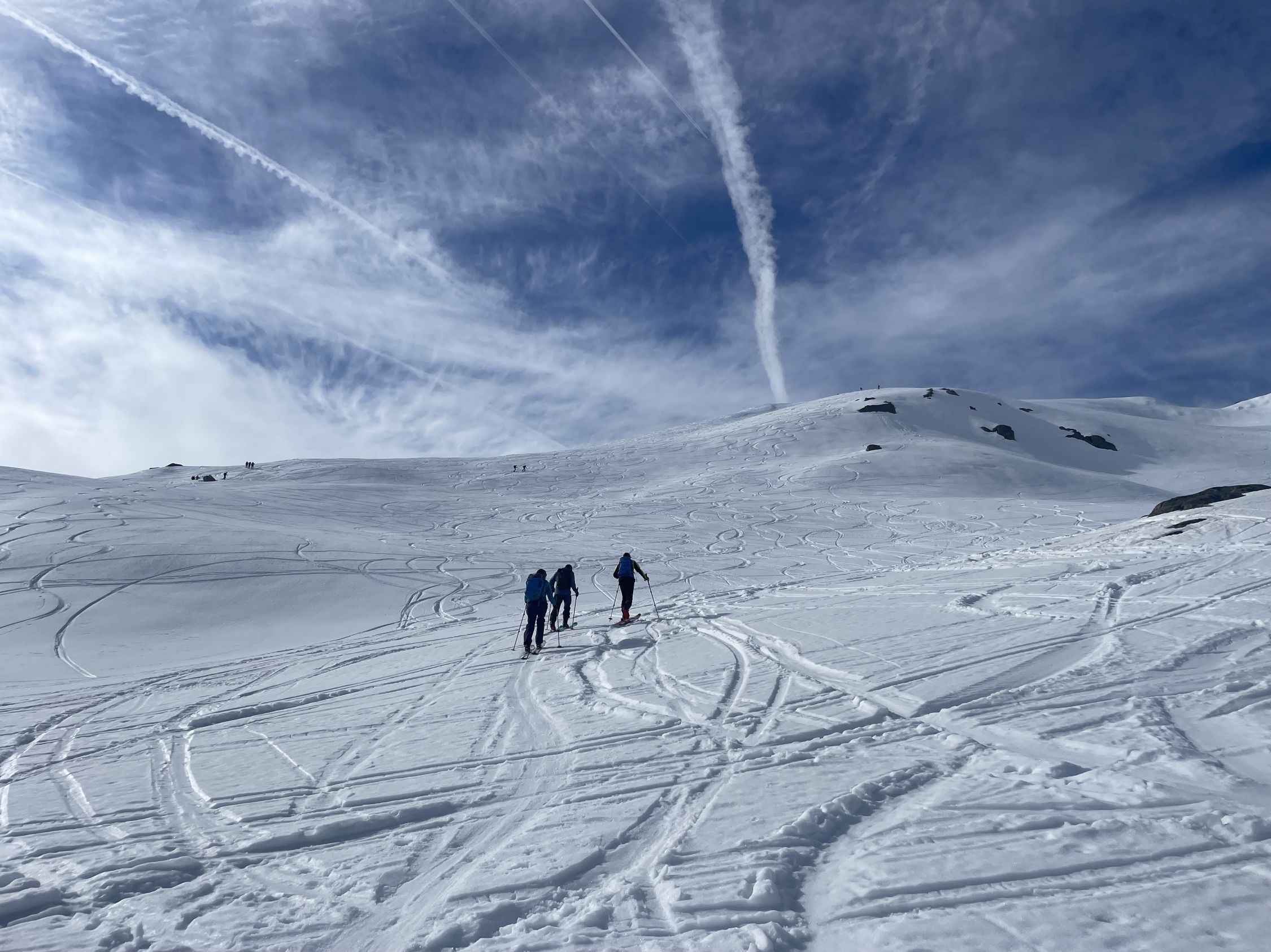 Wird besser und ist noch länger machbar. Die Schneemassen ab Pass sind erstaunlich: Wo man in den Vorjahren in den Rinnen und Runsen navigieren musste, war heute alles glatt!