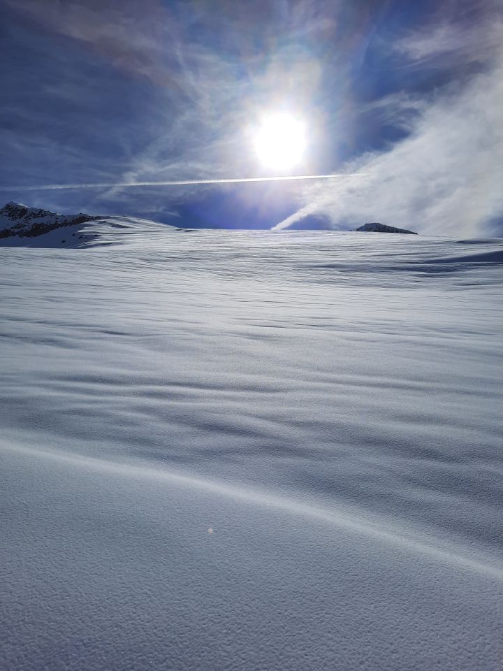 Oben Ausstieg Neuschnee hart, Abfahrt mit feinem Sulz.