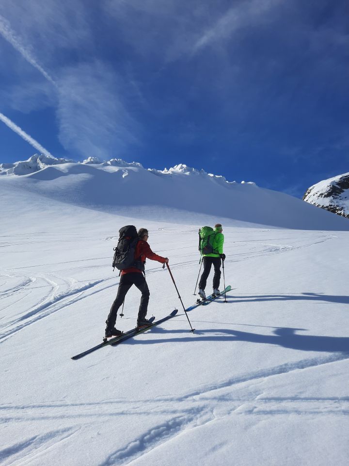 Die Strasse vom Steingletscher zum oberen Vom Parkplatz Umpol ist offen. Von dort direkt über das Chüebergli starten. Der steilen "Gletscherbruch" auf 2400 m Höhe kann mit Harscheisen problemlos bestiegen werden. Pickel und Steigeisen bleiben Zuhause.um 5:30 gestartet. geschlossene Schneedecke. Unten beim Aufstieg Altschnee hart, bei der Abfahrt faul.