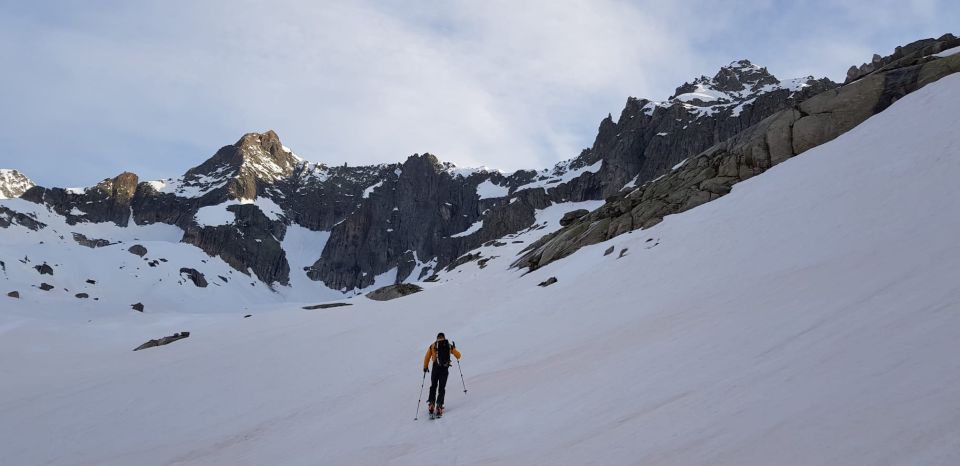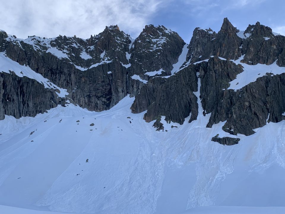 Start am Tiefenbach 5 Uhr bei +6°C nach nächtlichem Regen bis gegen 3000m hinauf. Restbewölkung löste sich rasch auf. Ski können aktuell etwas oberhalb des Parkplatzes für die Albert-Heim-Hütte angeschnallt werden. Ab 2200m auf harter, tragender Unterlage. Steilstufe bei 2700m mit Harscheisen. 2800 - 2900m mühsamer, harter Lawinenschnee. Couloir selbst bis Gulli in Lawinenrunse (hart), darüber rechts oder links der Runse meist guter Trittschnee. Am Ausstieg z.T. knietief. Schlüsselstelle mit durchweichter Schneeauflage (im aperen Zustand eine plattige IV). 9 Uhr am Ausstieg war heute definitiv zu spät, mindestens 1 h früher wäre optimal. Das Übersteigen der Platte war dementsprechend nicht mehr wirklich sicher, der Schnee blieb aber (auch nach dem Abstieg) noch auf der Platte. Die Abseilstelle ist etwas heikel zu erreichen, würde zwar die Platte entschärfen, hilft aber nicht für den weiteren Gipfelanstieg, z.B. als Zwischensicherung. Ab der Platte sind es ca. 80 Hm, über die es bei reichlicher Schneeauflage keine weiteren Möglichkeiten zur Zwischensicherung gibt. Aufgrund der expo bekommt die Gipfelflanke sehr früh Sonne, weicht also schnell durch. Wir wühlten uns entsprechend im knietiefen Nassschnee bis zum Gipfel durch, ob man das machen will/muss, darf jeder für sich selbst entscheiden..