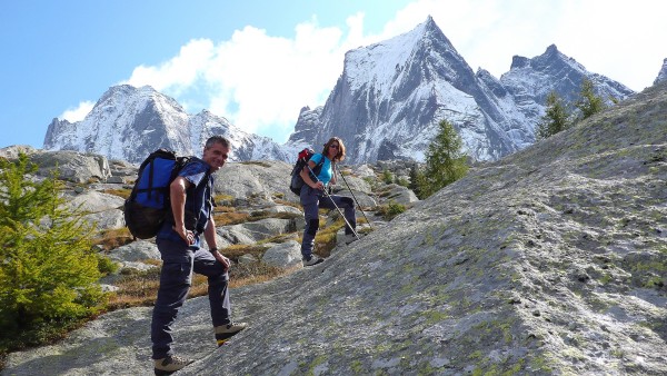 Tag 1: Es ist Ende September. Nebelfetzen hängen über dem Bondascatal. 4 Tage Trekking durch das Bergell haben wir uns vorgenommen. Auf dem Sentiero Alpinistico Val Bregaglia von Promontogno nach Maloja. Die Route gehört zu den grossartigsten und schönsten Tekkingtouren der Alpen. Der überaus gäche Fusspfad aus dem Val Bondasca hinauf zur Sasc-Furä-Hütte ist die Eintrittskarte zur Tour. Die Dramatik steigert sich zusehens. Von atemberaubender Steilheit und Eleganz sticht direkt vor uns die Nordkante des Piz Badile in den Himmel. Der Weiterweg zur Sciora-Hütte führt an die weltberühmte Badile Nordostwand heran. Generationen der besten Kletterer der Welt haben hier immer wieder neue, waghalsige Routen eröffnet. Die Cassin-Führe durch die Nordostwand des Piz Badile gehört heute noch zu den schwierigsten klassischen Klettertouren. Noch bevor wir den Gletscherkessel unter der Badilewand erreichen, müssen einige Felsabbrüche (teilweise mit Ketten gesichert) abgeklettert werden. Dann geht’s im auf und ab hinüber zur Sciora-Hütte, die in beeindruckender Lage unter den Granitpfeilern der Scioratürme, wie auf einem Adlerhorst thront.