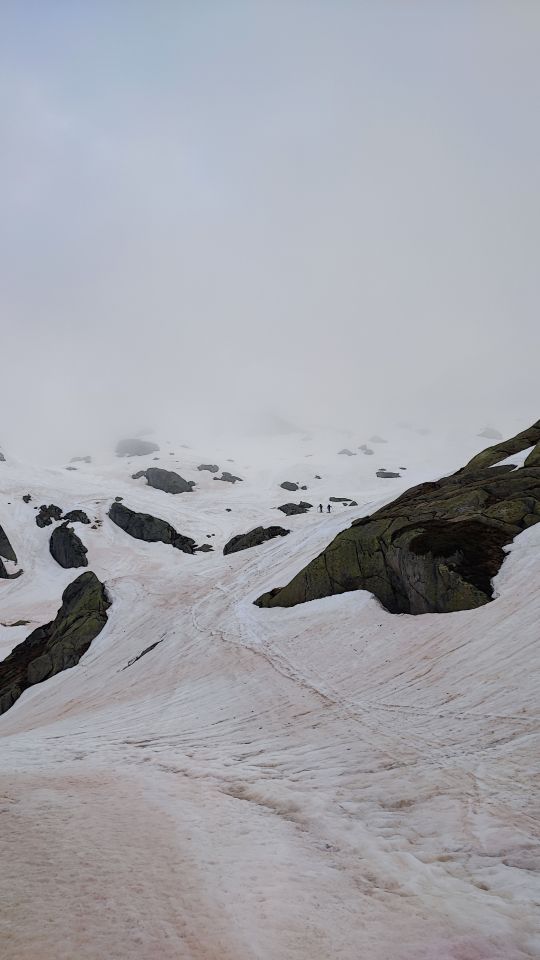 Schnee hats noch lange, das könnte sich ausgehen für eine Juli Skitour. Beim Start um 05.45 noch dicke Nebelsuppe, ab und zu kurzes Auflösen. Aber so recht wollte die Sonne nicht kommen im Aufstieg. Lange Pause am Gipfel. Abstieg dann an der Sonne. Harscheisen heute nicht nötig.