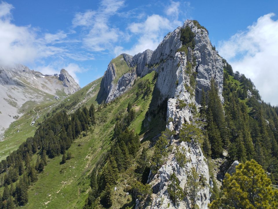 Wetter etwas durchzogen aber meistens sonnig. Einstieg in die Route um ca. 11 Uhr über die linke Einstiegsvariante. Dort feuchte Stellen, was das klettern nicht gerade vereinfacht. Oben am Grat alles trocken und Genuss pur!