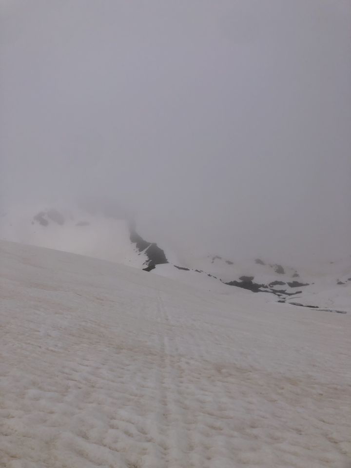 Hervorragende Schneelage für die Jahreszeit. Durchgehend Schnee vom Parkplatz bis zum Gipfel. Oben etwas sumpfig durch den noch nicht ganz gesetzten Neuschnee, Unten bester Sommerschnee. Weich, aber sehr gut fahrbar.