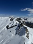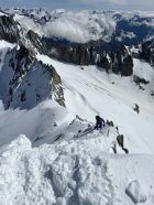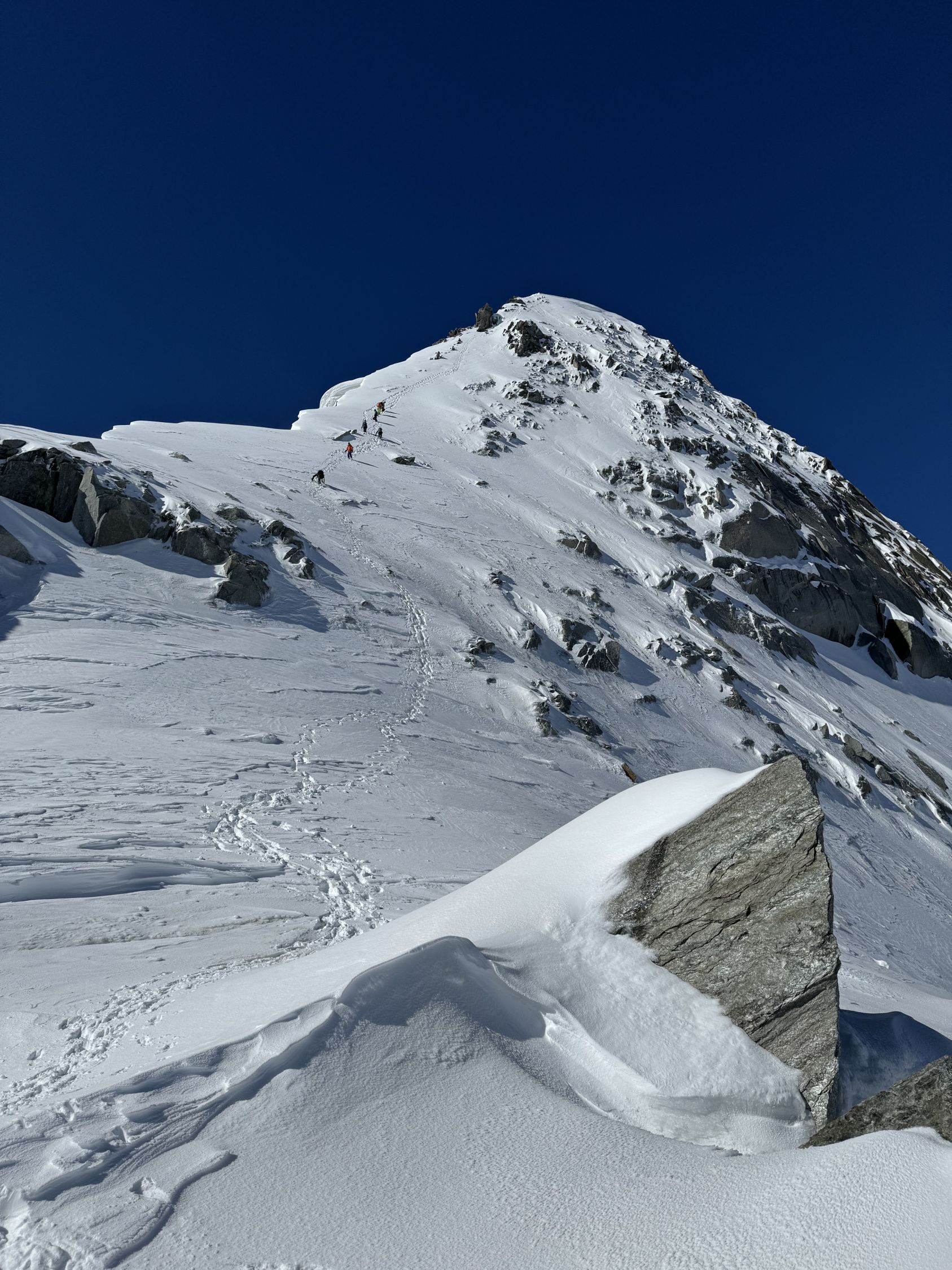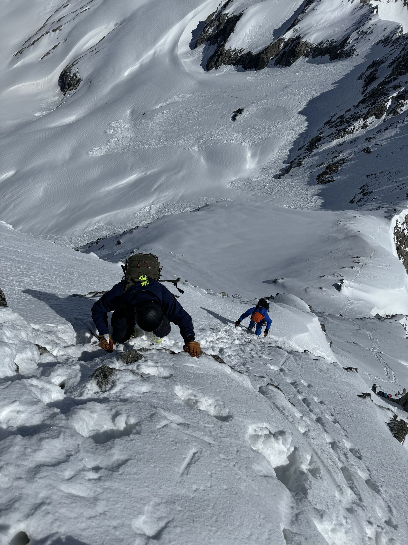 Wir sind durch das couloir gegangen. Schnee im couloir war früh weich. Auf dem grat war schon ein spur. Mit steigeisen und pickel gut machbar