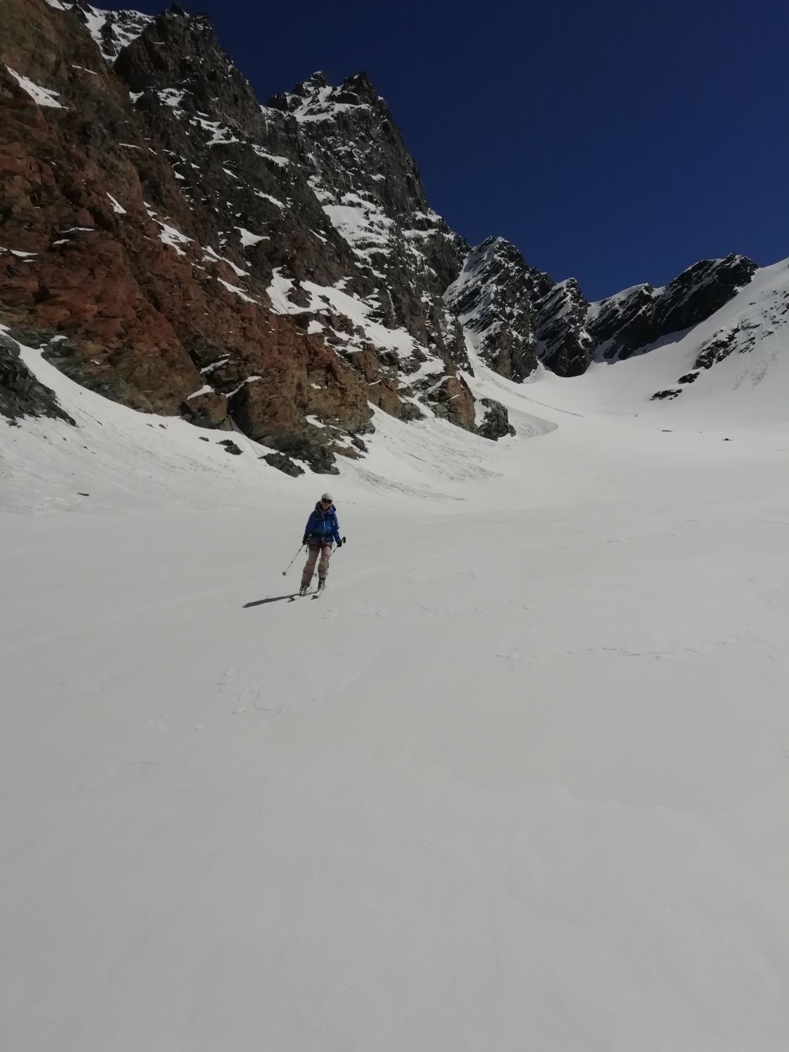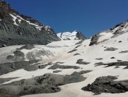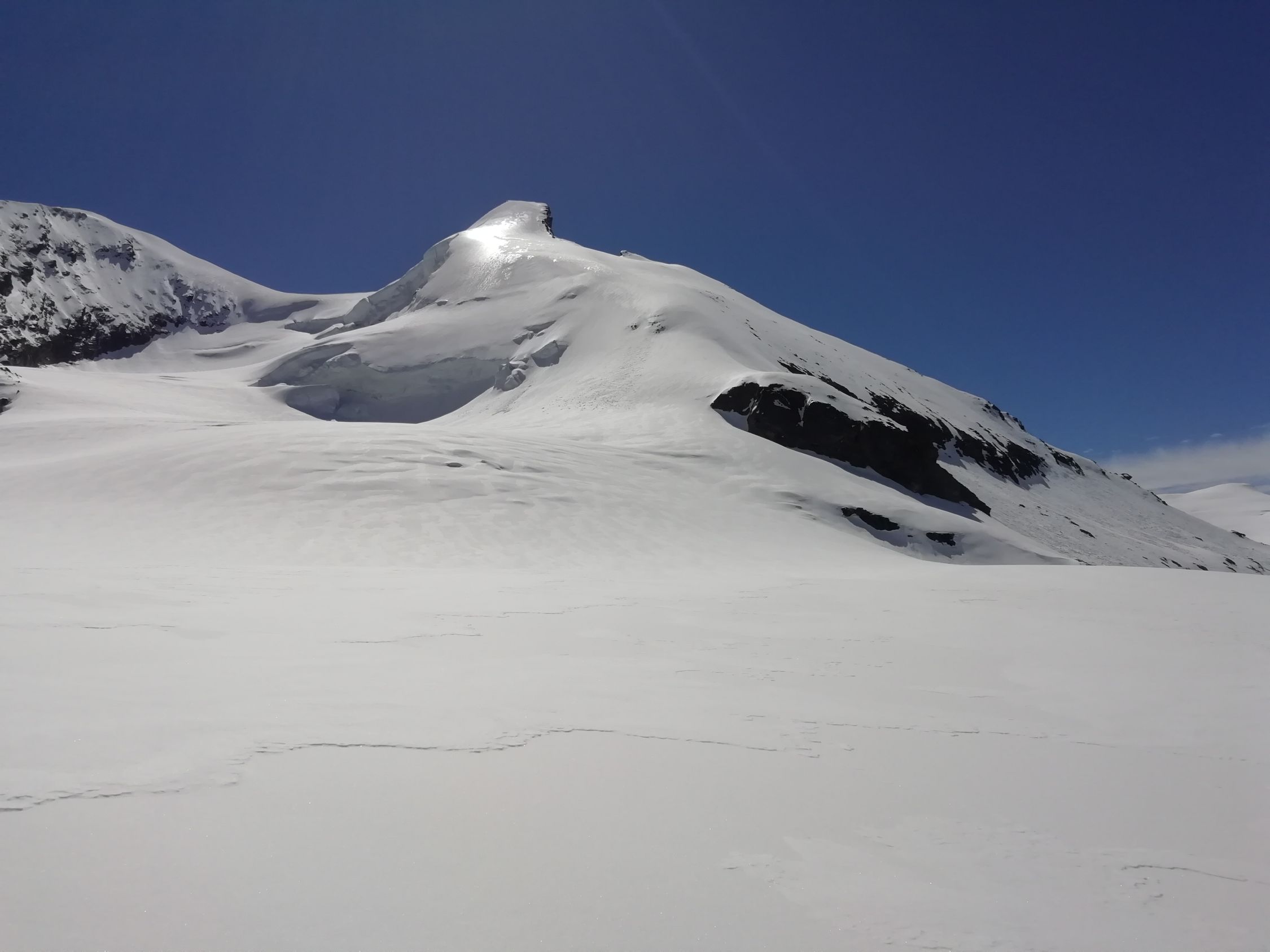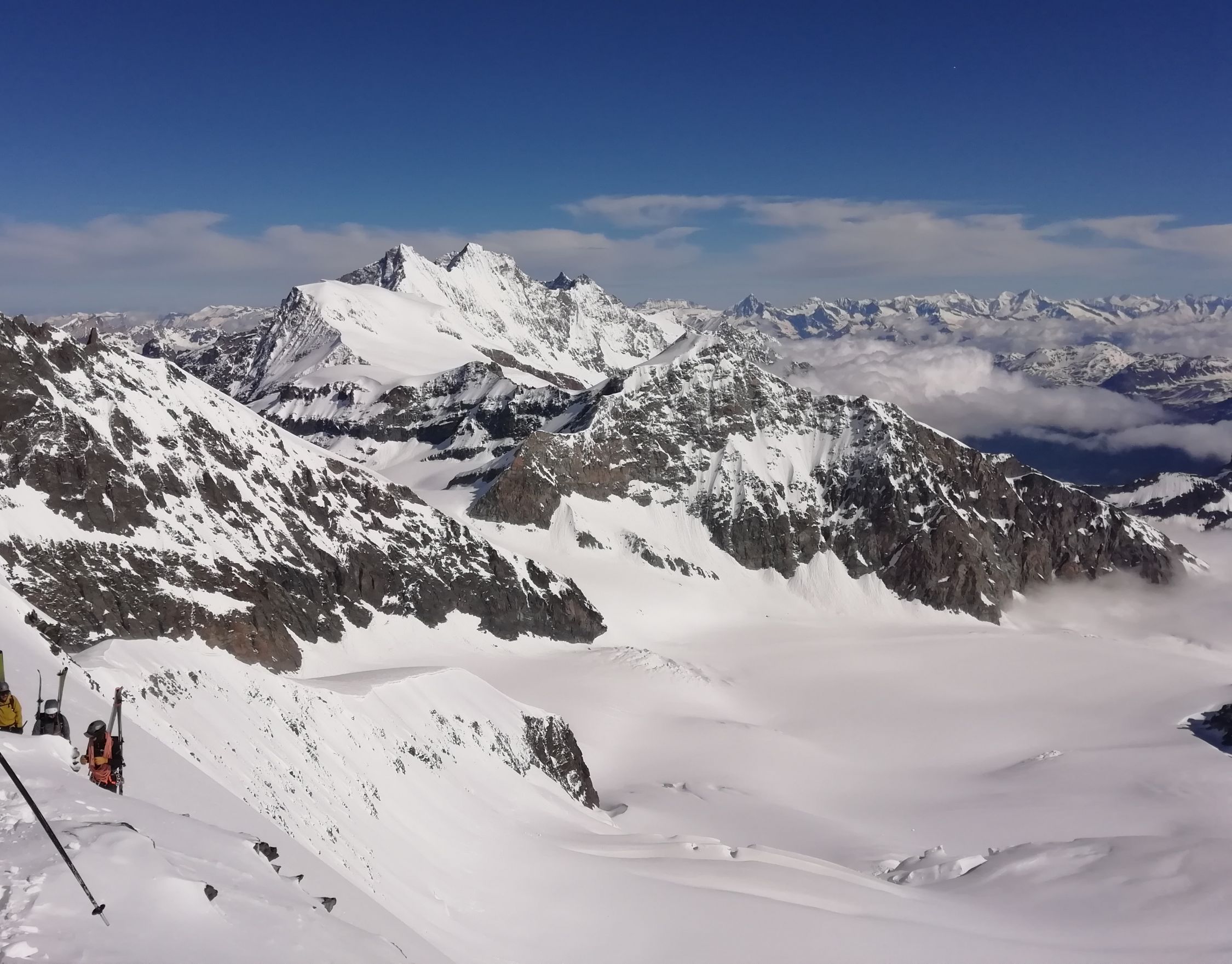 Oben sehr gut zu fahrender Pulver auf Hart, auch in der Flanke vom Adlerpass nach Westen runter, ab 3300m dann Firn vom Feinsten. Der Übergang zum Findelengletscher ist nicht ganz einfach, am besten geht es direkt unterhalb P3008 in schlecht einsichtigem Gelände exakt nach WSW, dabei ca. 20m recht steil und mit zwei Fischmäulern, die auch zu Fuss in der schmutzigen Moräne umgangen werden können. Die in der SAC Karte eingezeichnete Route ist nach unserer Einschätzung nicht möglich. Bis Findelengletscher-Ende (derzeit etwa beim grossen "F" in der LK) geht es noch gut mit Ski, möglichst weit links haltend, danach zu Fuss zur Riffelalp. Seewijnen hat geöffnet. Auf die Matter Seite ist wohl schon länger niemand abgefahren, jedenfalls waren keine Spuren sichtbar und wir waren die Einzigen. Rückblickend halten wir die Abfahrt auf der Matter Seite immer noch für effizienter als 2x Gegenanstieg und Fussmarsch nach Saas Fee, will man nicht die Felskinn Bahn zu Extrapreisen benutzen. Insgesamt lohnt sich das Strahlhorn als Skitour sicher noch 2 Wochen.