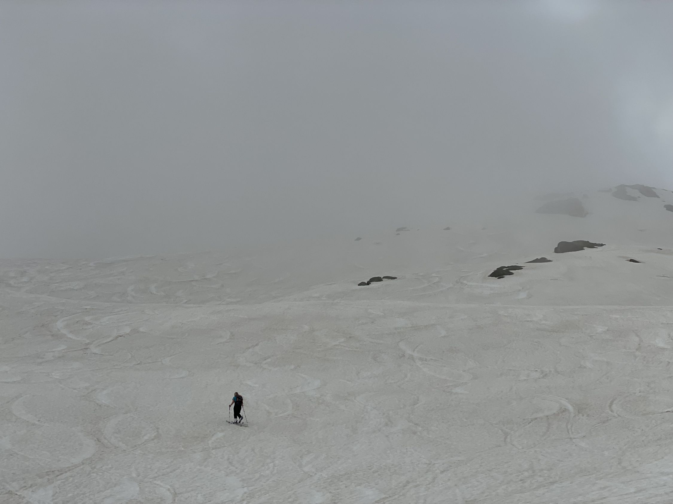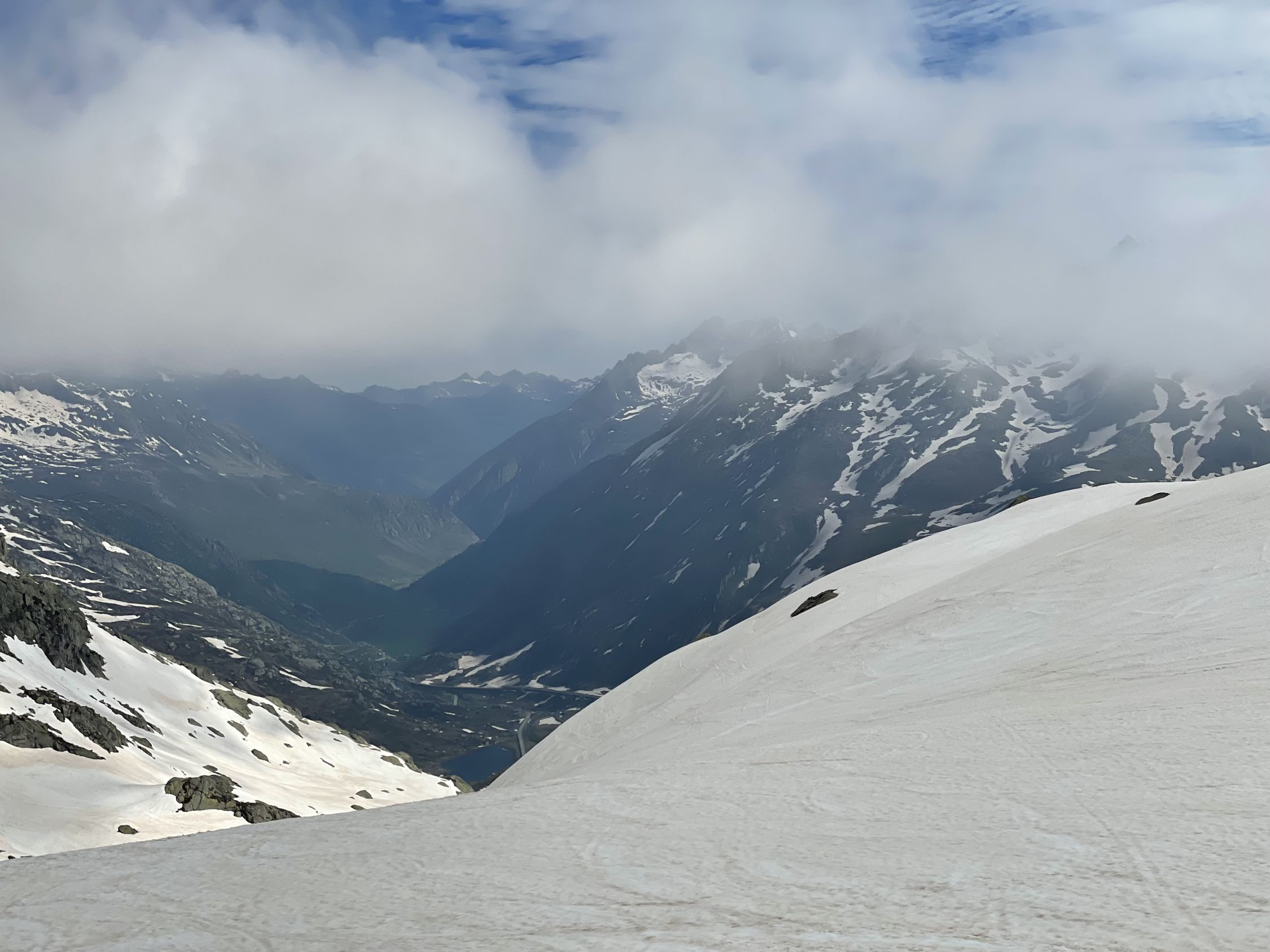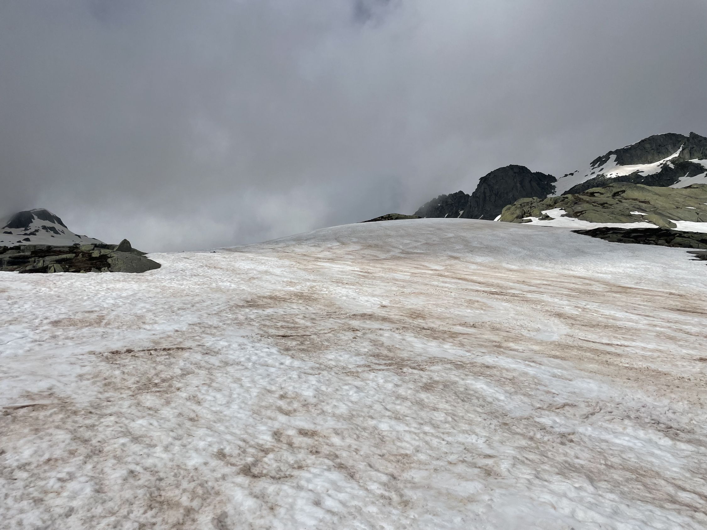 Wir wollten mal schauen, wie sich die Verhältnisse seit unserem letzten Abstecher vor 14 Tagen geändert haben. Erwartungsgemäss hat der Schnee abgenommen, es hat aber immer noch genug davon. Vom Start bis zum Gipfel völlig durchnässt, kein Wunder, immer wieder Regen und kaum je eine klare Nacht… Aber dafür ist der hässliche Bruchharst vom letzten Mal verschwunden. Im Aufstieg war das kurze steile Stück gar nicht so ohne, der nasse Schnee rutschte und bot keinen sauberen Halt. Weiter oben wurde die Fibbia dann ihrem Ruf als Nebelküche gerecht, durch die Spuren fand man den Weg aber einfach. Am Gipfel nettes Gespräch mit einer Tourengängerin aus Erstfeld, wir waren momentan die Einzigen oben. Generell heute nicht viele Leute unterwegs. Aussicht gab es heute nicht, aber angenehmerweise gute Sicht in der Abfahrt. Der Nassschnee liess sich gut schwingen, bis zum Pass hinunter eine erfreuliche Sache.