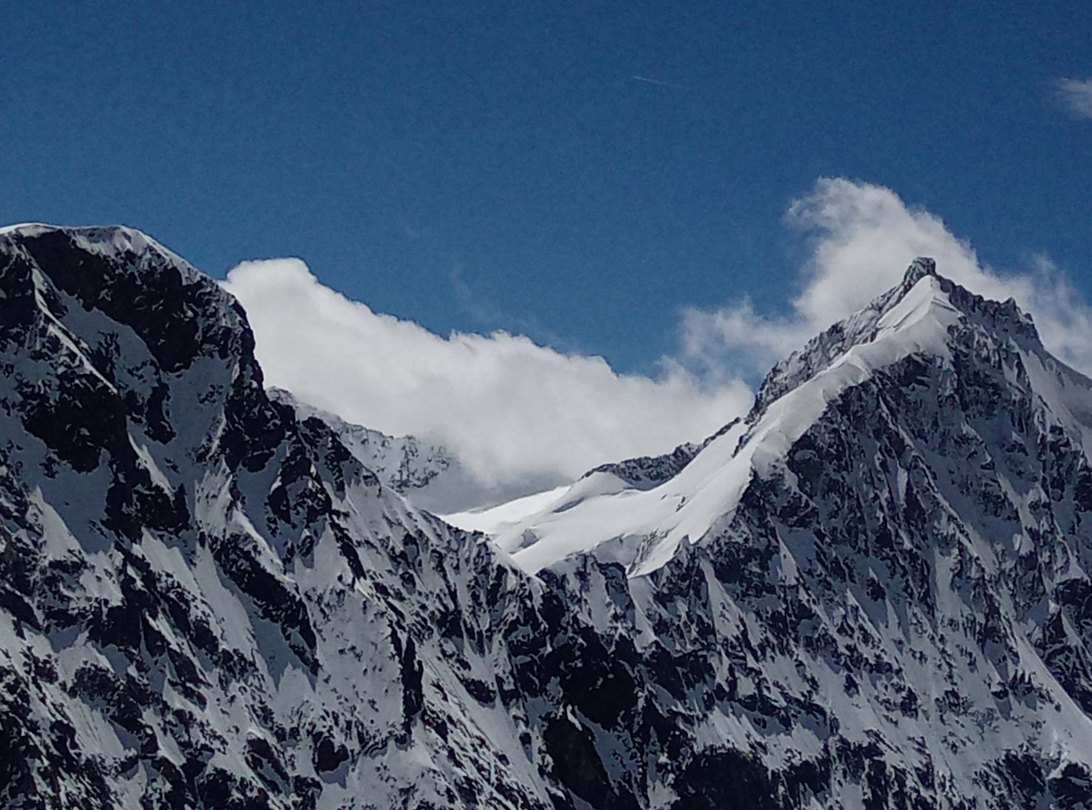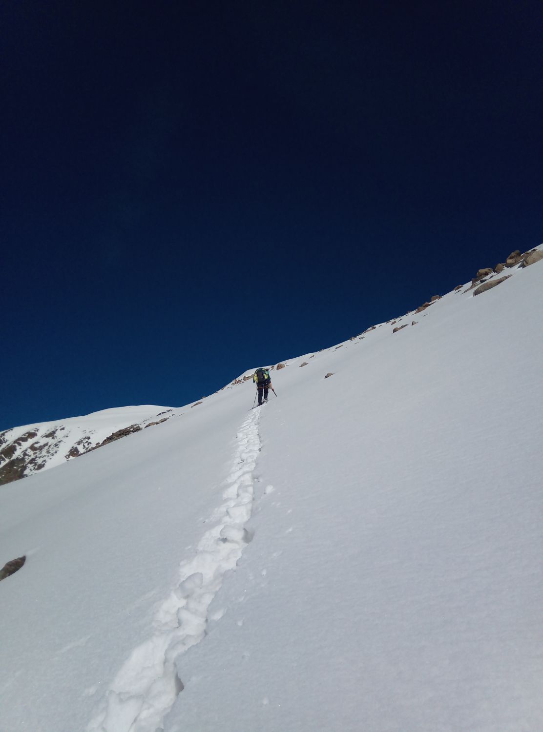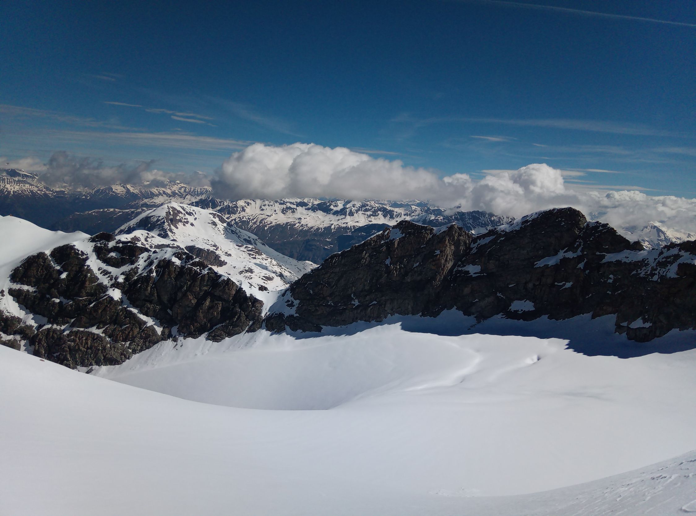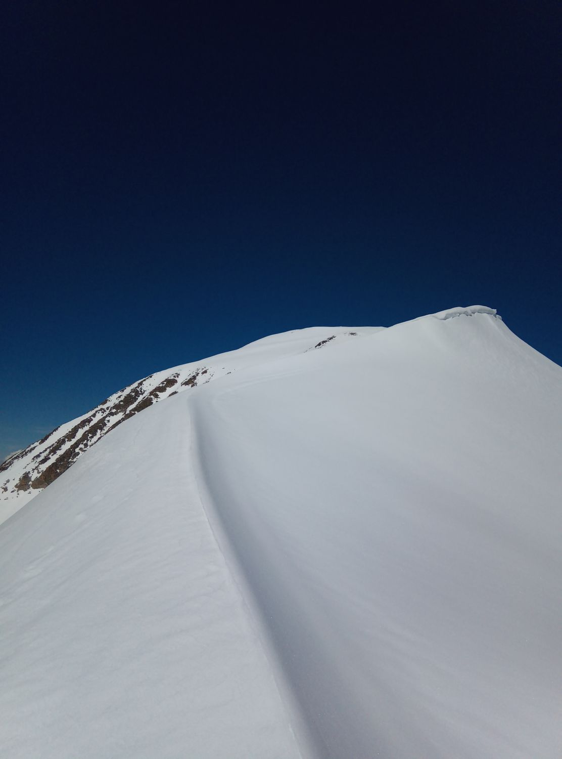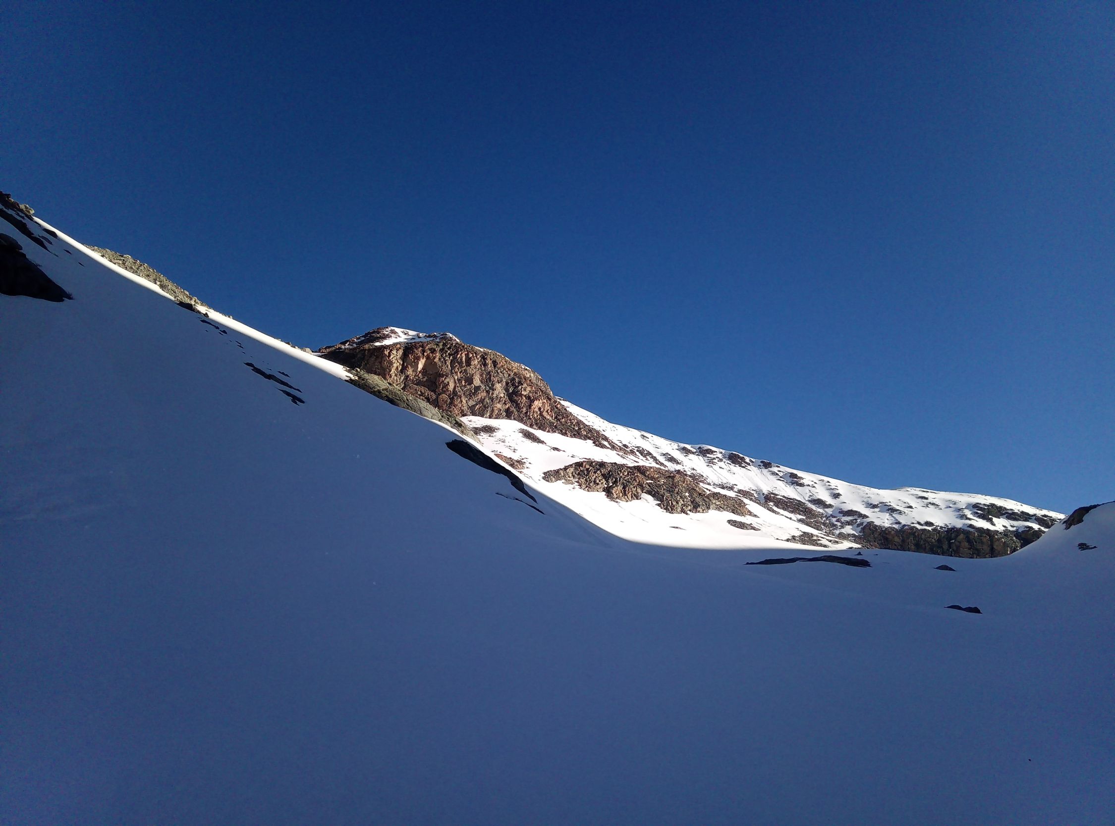 Felsband oberhalb Hütte Schnee frei. Ab 2800m inkl. S-Hang zur Fuorcla Tschierva durchgehend starke Schneedecke, nicht trittfest. Aber bestens zu machen mit Schneeschuhen, bis auf den Gipfel und wieder runter.