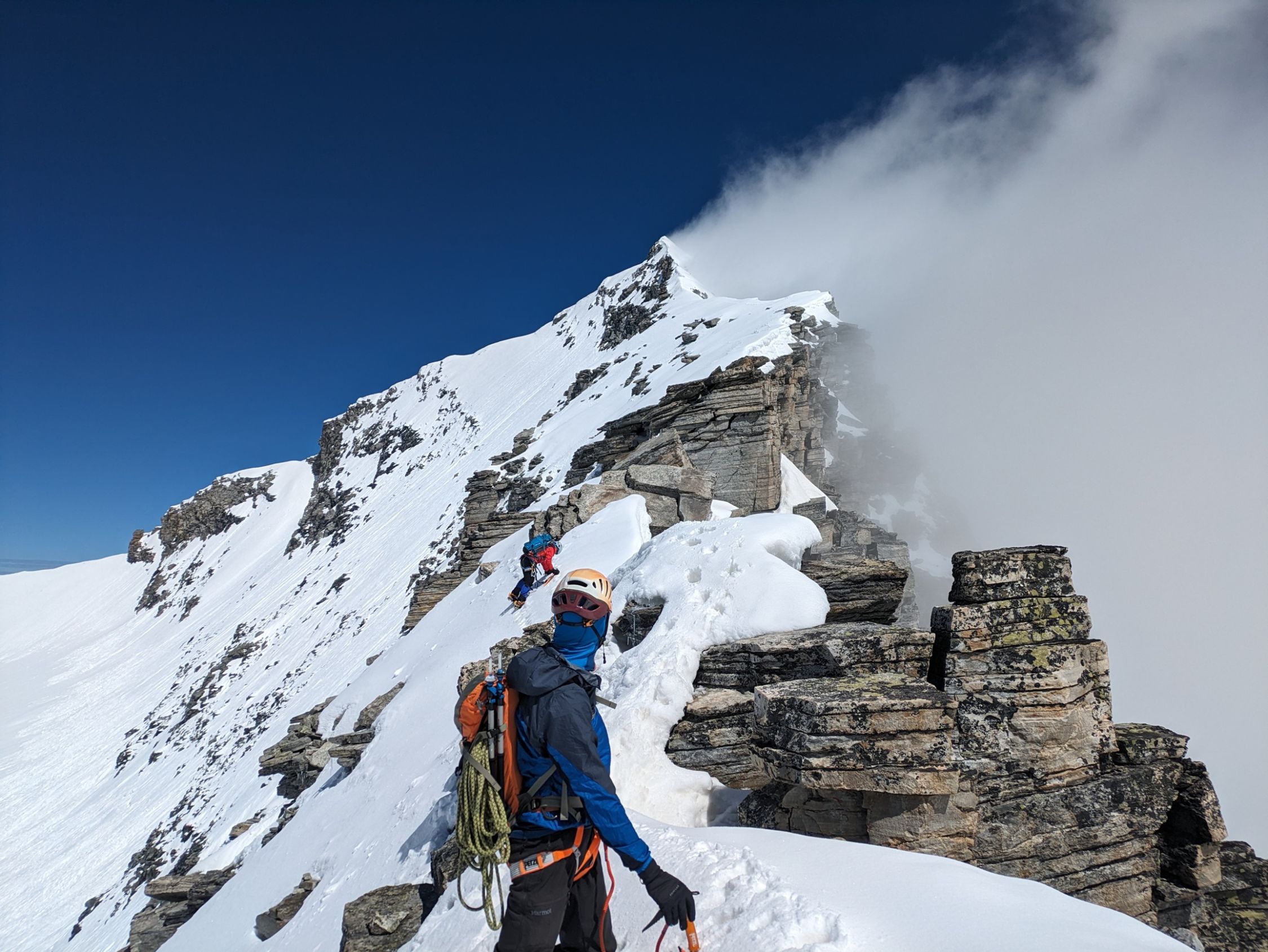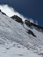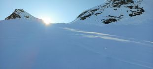 Es liegt noch sehr viel Schnee ab etwa 2500 M, wir sanken knietief ein, spuren war entsprechend zeitaufwendig und mühsam. Einstieg auf den Grat 45° Firn, gut zum pickeln. Der Grat selber war für unsere Erwartungen auch zu eingeschneit, zudem unsicherbar, kleine unstabile Wechten und die letzten Meter zum Gipfel eventuell etwas zu steil und verwechtet. Wir haben nach dem ersten Gratabschnitt umgedreht, da uns noch eine lange Heimreise erwartete und das Ganze sowieso viel Zeit gebraucht hat.
