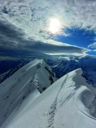 Start um 3.30 Uhr ab Blüemlisalphütte, ohne Spur bis ca 3200m tiefer Schnee, schlecht tragend, dann ab dem Aufsteilen der Flanke aus Morgenhorn guter Trittschnee. Am Morgenhorn bis zum Gendarmen unproblematisch, Gendarm im Schnee, die Eisenstange hinter dem Fels haben wir erst später gesehen. Alle Kletterstellen grossmehrheitlich im Schnee, keine Bohrhaken gesehen, Stangen teilweise sichtbar. Schnee auf dem ganzen Grat gut zu gehen, viele Wächten. Abstieg Blüemlisalphorn im oberen Teil gut eingeschneit, untere Passage mit den Stangen oberhalb Rothornsattel wird demnächst ausapern. Ab Rothornsattel tiefer, nasser Schnee bis zur Hütte. Spalten keine gesichtet.
