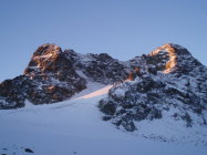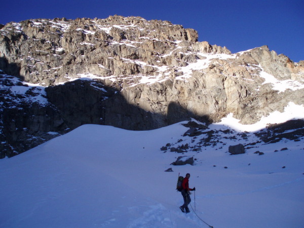 Stampfen auf dem Gletscher, etwa 15 cm. Die harte Deckel bricht immer ein. Spalten beachten, Vadret da Porchabella sieht nicht harmlos aus! Ab ca. 3220 M.ü.M.. Klettereien bis II. Grad. Gute Spur vorhanden, dank Vorgänger. Drei Bohrhacken für Abstieg vorhanden. Wir sind ganz alleine auf dem Gipfel!