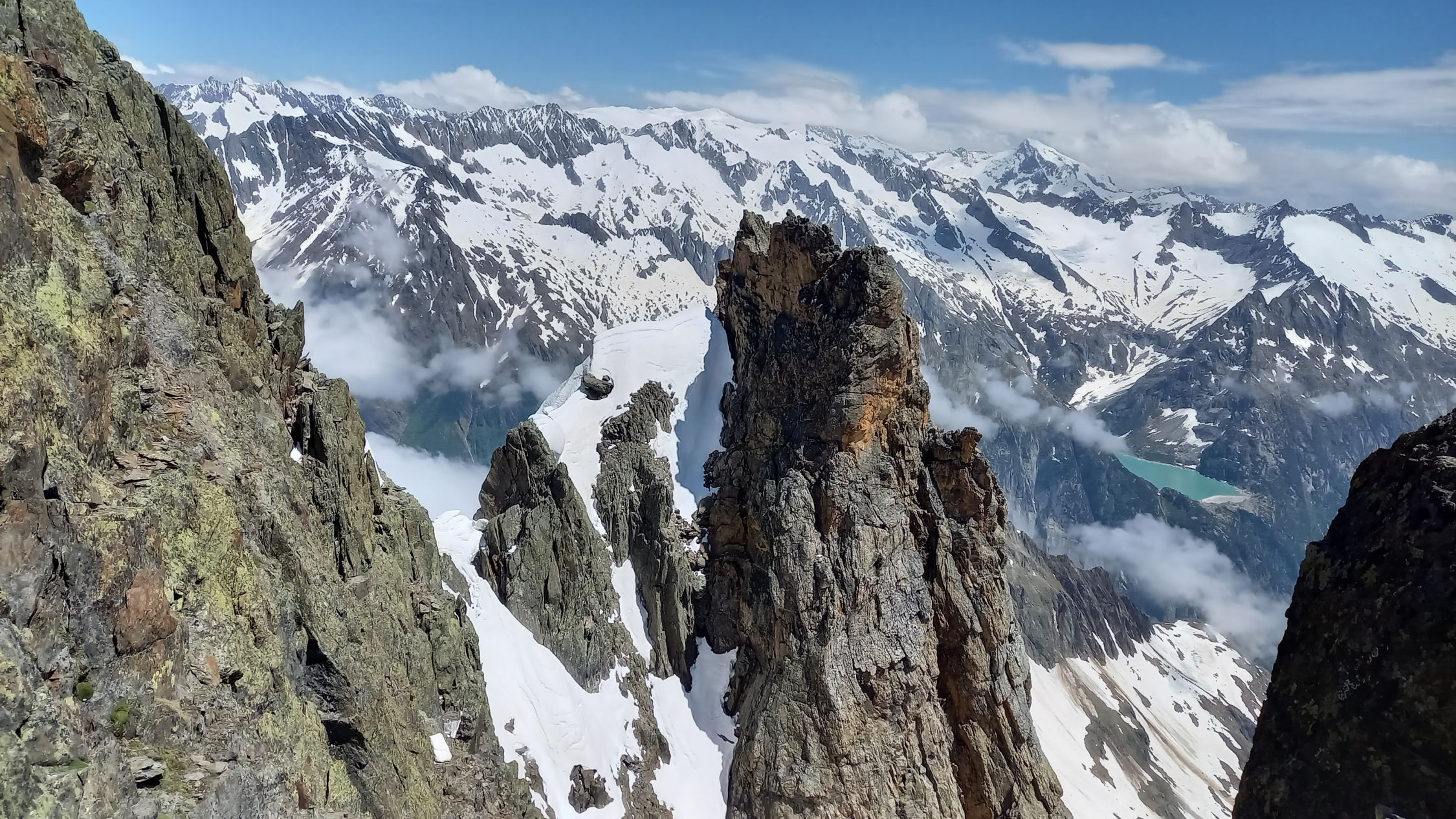 Weiterweg bis P 3193 wegen steiler Schneewächte auf dem Grat mühsamer als sonst: 2 Diagonal-Abseiler nach S und jeweils Wiederaufstieg gehen gut, kosten aber Zeit.