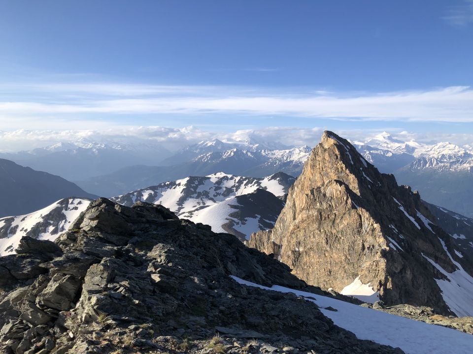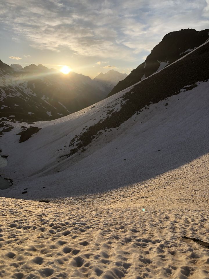 Tragstrecken nehmen rasch zu. Die Tour begann ich ab Lauchernalp, mit Aussenübernachtung auf Kummenalp. Start heute 05:00, Temperatur +9, schwachwindig. Schnee ab Brücke über den Ferdenbach, bis oberhalb Zem Tritt 3 kurze Tragestrecken, Zahl und Länge rasch zunehmend. Oberster Hang zum Galmpass tragend. Aktuell Ski bis 15 Hm unter Gipfel problemlos. Viel Kachelstruktur in der Schneeoberfläche, jedoch gut zu fahren. Allein unterwegs im Gebiet