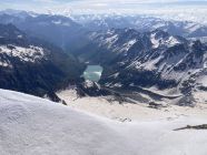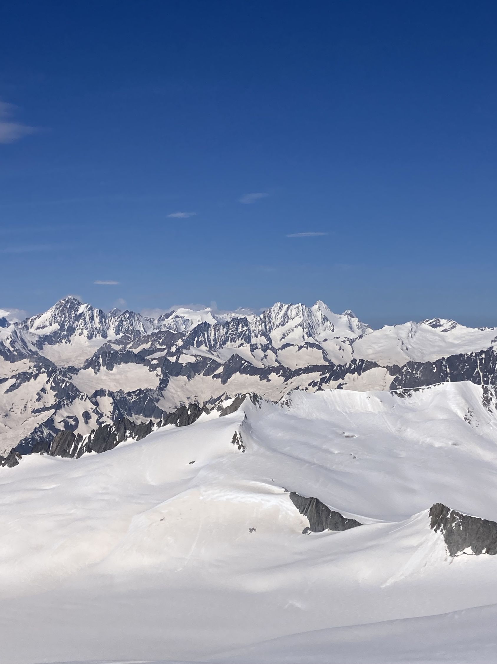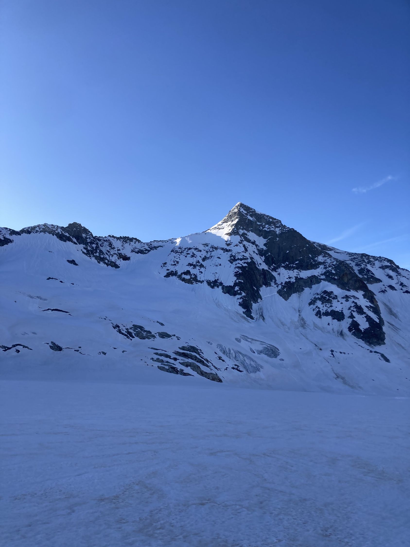 Abfahrt: die obersten 500 HM hart, aber griffig. Dann kurz einbrechend, danach mehrheitlich guter, am Schluss saharasandbremsender Sulz-Schnee. Alles in allem: noch lohnend bei so Traumwetter.