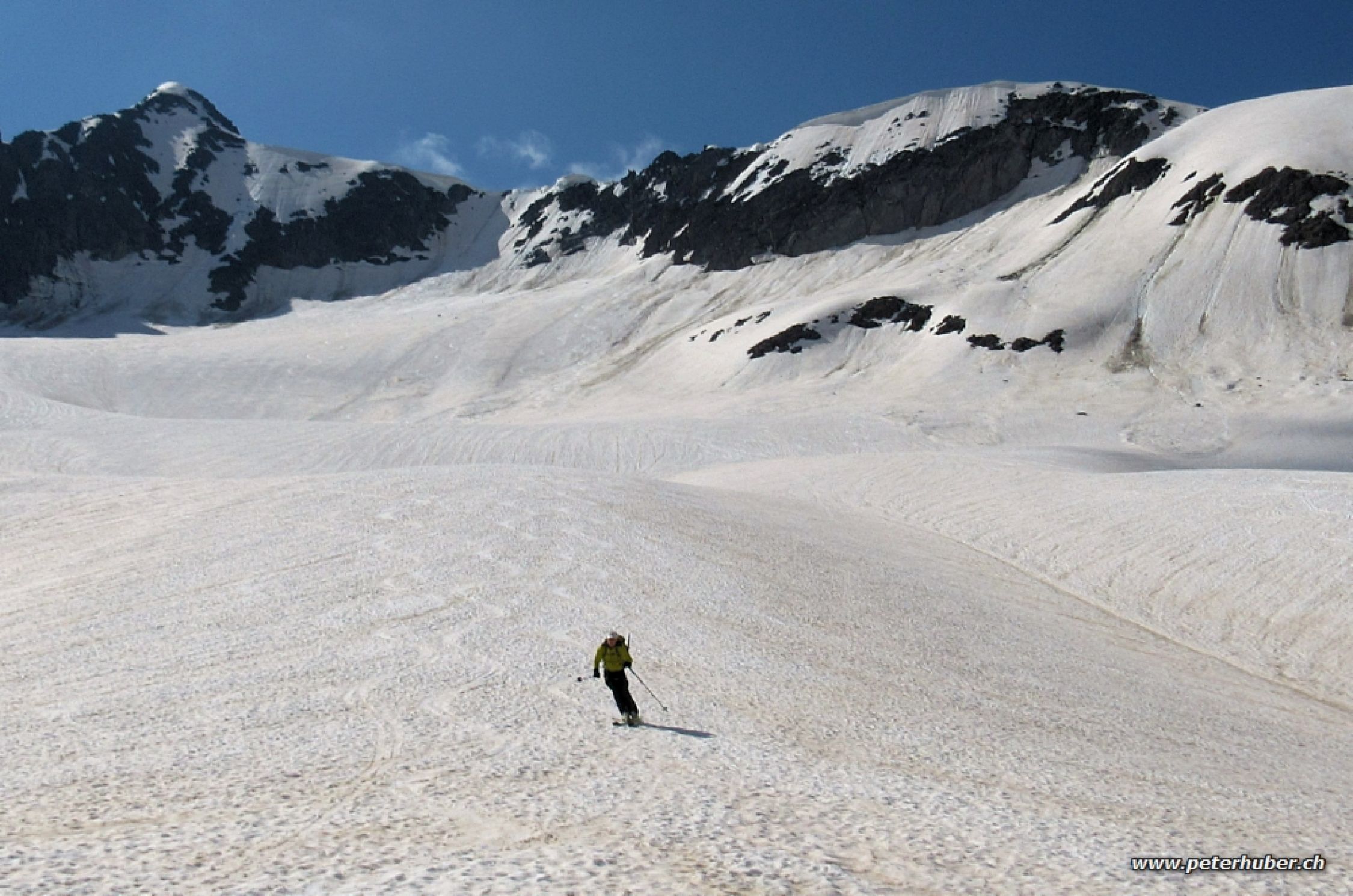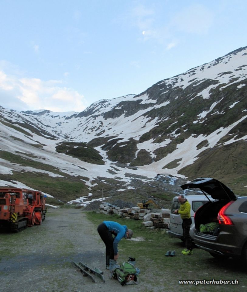Morgens um 5:30 Uhr hat es noch kurz geregnet. Beim Start um 6 Uhr beim Tunnel dann wieder trocken. Oft sonnig mit einigen vorüberziehenden Wolken. Nach einigen Minuten Ski tragen hatte es nicht gefrorenen, aber gut tragenden Schnee. In den ersten 200 Hm muss man den Weg zwischen den Steinblöcken etwas suchen, doch es hat noch genug Schnee. Weiter oben dann problemlos. In der Steilstufe oberhalb des Skidepots hat es guten Trittschnee. Die restlichen Meter zum Gipfel haben dann alle Tourengänger zu Fuss gemacht. Auch oben hat es guten Trittschnee.