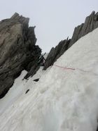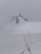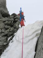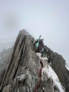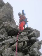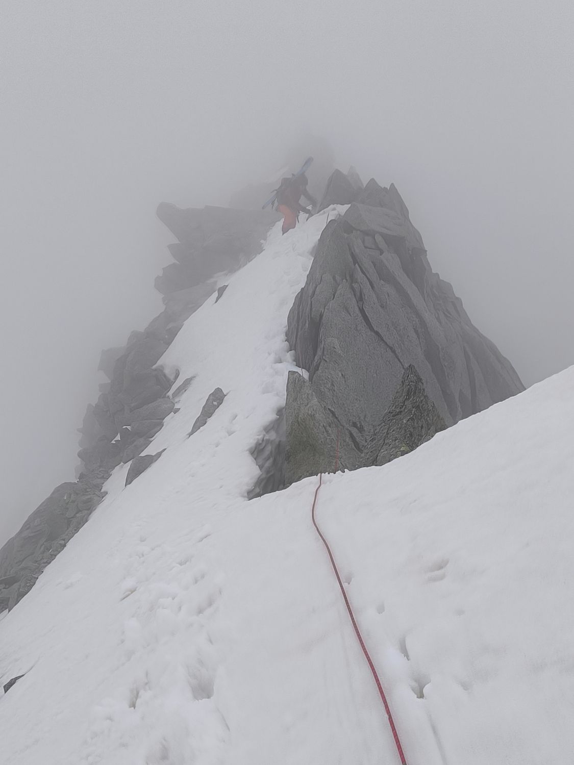 Der frühe Start um 4:15 in Tiefenbach brachte eigentlich nichts. Abstrahlung gab es nicht dafür kurzer Nieselregen unterwegs. Spätestens beim Tiefengletscher waren wir hellwach als eine tonnenschwere Felsplatte von ca 5m auf 5 m den Hang runter gleitete. Wir ließen uns nicht beirren und querten den Steilhang oberhalb des neu entstandenen Gletschersees zügig. Bergschrund am Couli zum Nordgrat sah bei dem nassen Schnee nicht sehr sicher aus. Wir stiegen bei den Eisenbügel hoch und mieden bis zum Erreichen des Nordgrates die viel zu weichen Schneefelder. Beim Ausstieg zum Nordgrat war das Schneefeld nicht zu vermeiden. Dort konnten wir zumindest mit Seil gut sichern bei einem eventuellen Schneerutsch. Am Nordgrat war der Schnee auch nicht besser. Somit waren die Traversierungen der steilen Flanken heikel. Ohne Seilsicherung wäre spätestens jetzt umdrehen angesagt. Der oberste Teil des Nordgrates war wieder sehr angenehm. Statt im weichen Schnee nie richtigen halt zu haben waren die Felsen im obersten Teil des Nordgrates wie Baldrian. Statt 4 Std wie vor 2 Wochen benötigten wir 8 Std. Die Bedingungen haben sich durch den vielen Regen massiv verschlechtert. Wir fanden die Tour abenteuerlich bei wenig Sicht und schlechten Bedingungen. Der Rückweg von Eisgrotte nach Tiefenbach war per Auto-Stop dafür sehr flott. Danke fürs Mitnehmen.