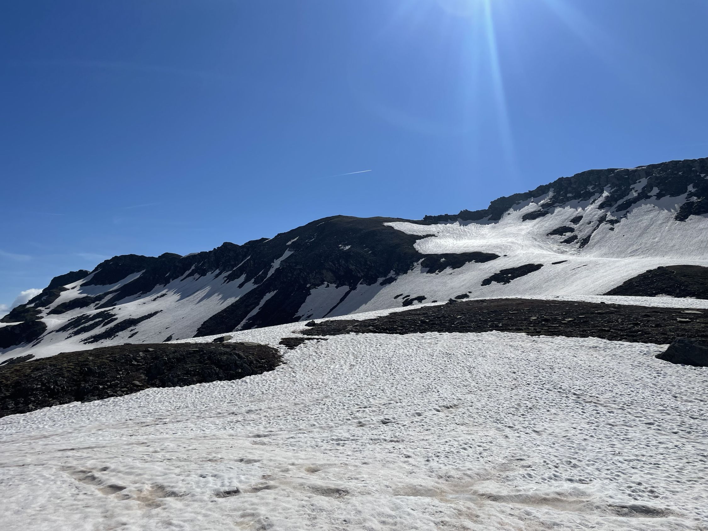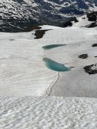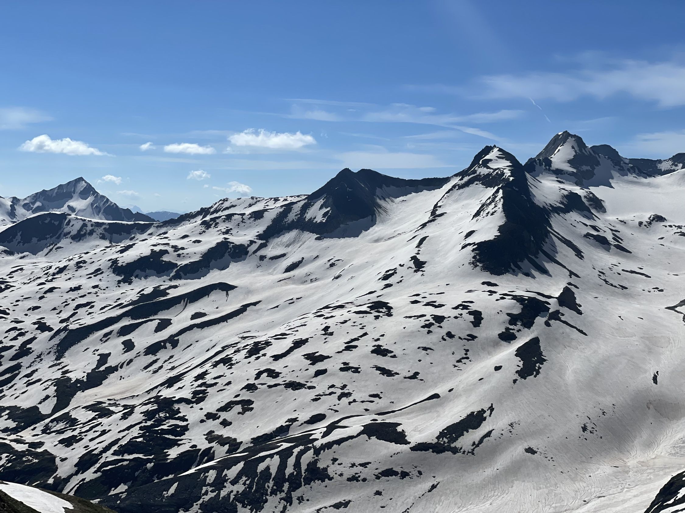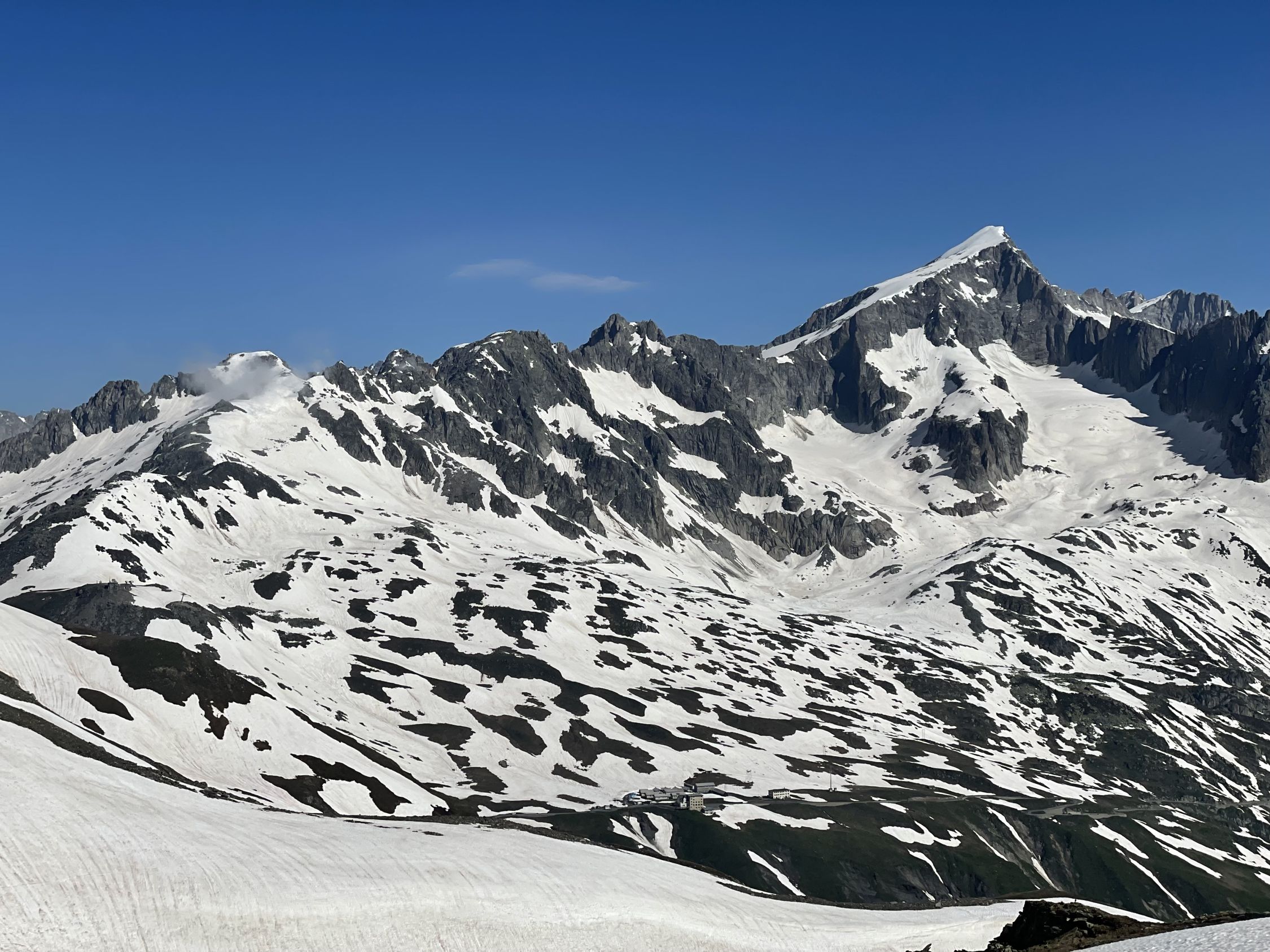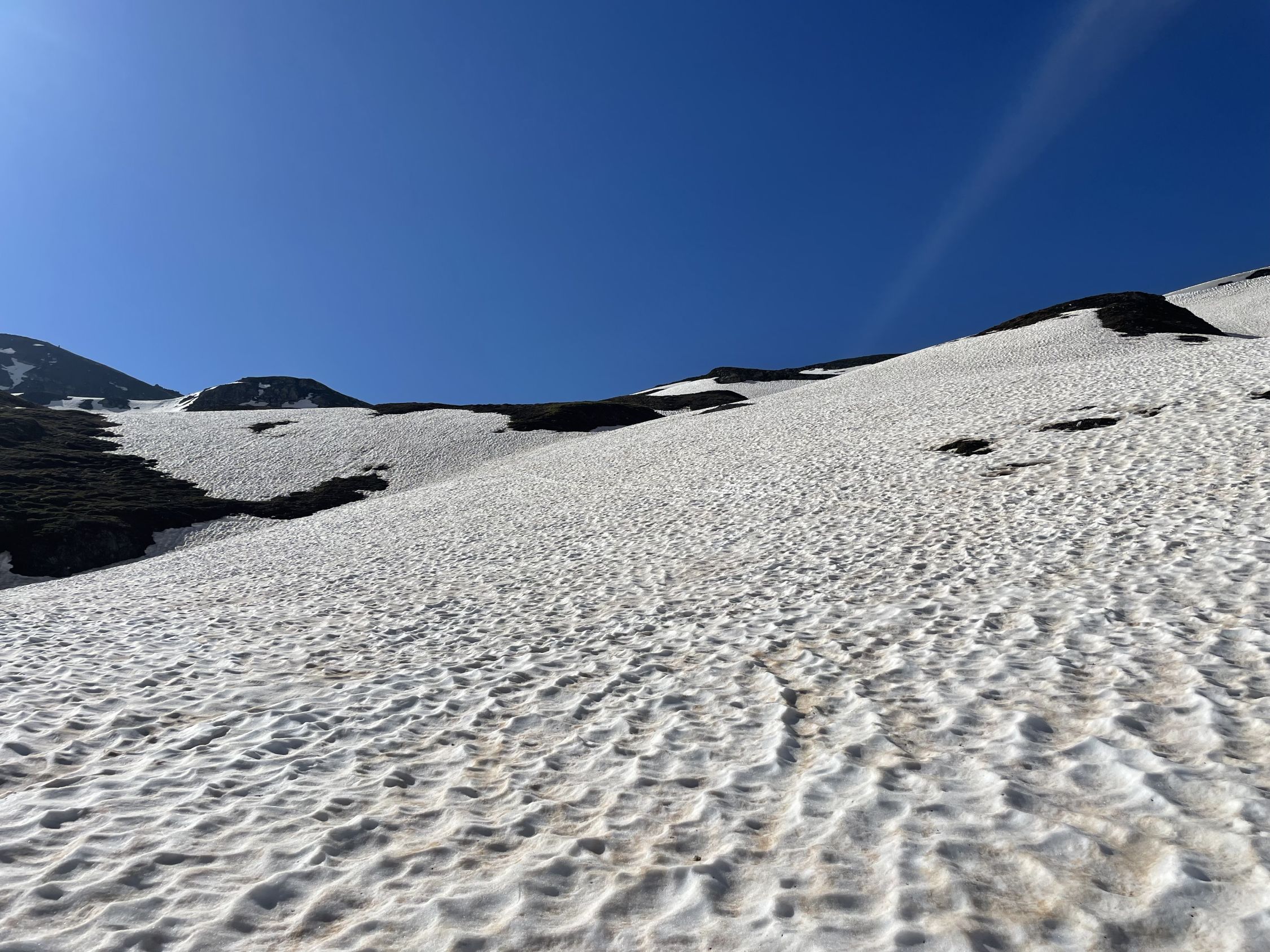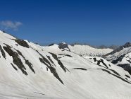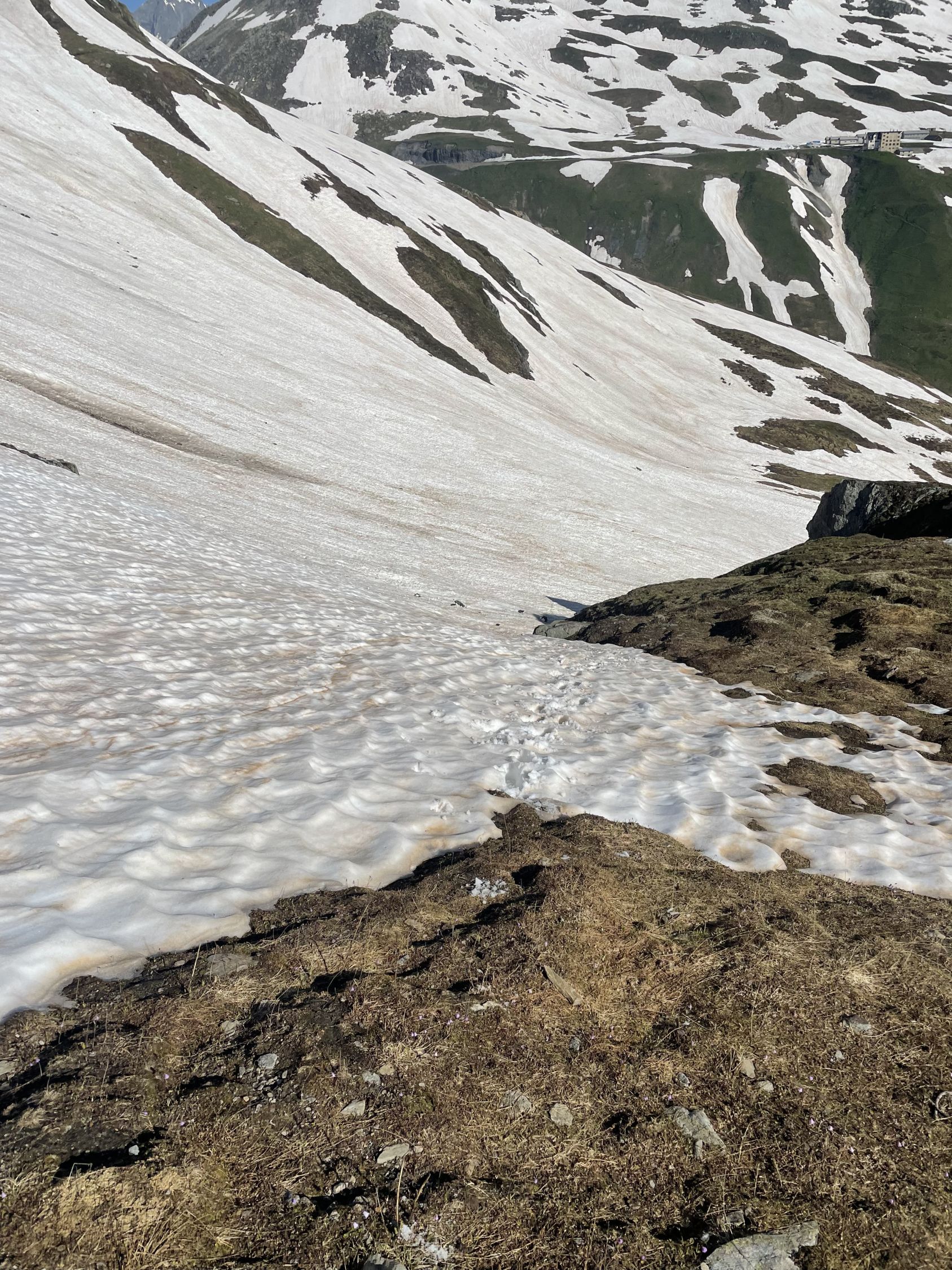 Der Frühling ist auch auf den höchsten Pässen mit Macht angekommen. Das hier geht sicher noch ein paar Tage. Blick in die Runde: Klein Furkahorn ab Pass wurde gemacht und Gross Muttenhorn sicher auch, dem PP nach.